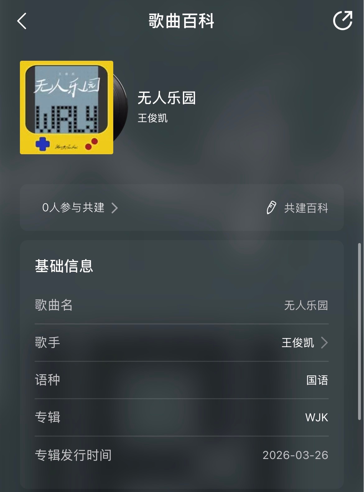 专辑:《WJK》歌曲简介:这是来自WJK世界的一份祝福,送给在喧嚣世界里,独自向前的你。在人群与雨天之间,在喧哗与沉默的缝隙里,我们被推着向前,奔赴每一个必须抵达的明天。这首《无人乐园》,不是关于抵达,而是关于在路上。当世界催促我们各就各位,当生活没留出时间预备,我们早已独自上路。这是每个人都在经历的日常,穿过人群与雨天,穿过楼宇的光线,穿过那些终将散场的约。「无人的乐园」不是一个地点,而是一种心境。是我们与自己独处的空间,那里装着所有季节,所有眼泪,所有闪闪发光的灰,装着那些想被珍藏的记忆。在那里,我们可以暂时不说再见。编曲以节奏推进为核心,鼓点像脚步般持续向前,几乎不留停留的余地。电吉他与弦乐交织,构建出既现实又抽离的空间感。王俊凯以克制而带有冷感的声线切入,在孤独中确认存在,在失序中寻找秩序。在这个乐园里,我们允许一切发生,也拒绝说再见。愿你带着那些"事与愿违",也依然向前。