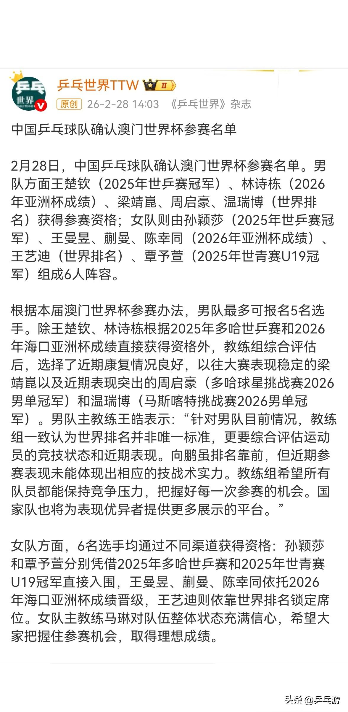 🏓向鹏3-1温瑞博,自己失去的,又靠自己的实力赢了回来, 争气! 虽排名靠前,但因“近期参赛表现未能体现出相应的技战术实力”(王皓),而痛失世界杯参赛资格的向鹏,知耻而后勇,知不足而后进。 这次世乒资格选拔赛,向鹏真的很争气,自己失去的,自己又夺了回来! 3-2赢了陈垣宇、徐瑛彬不说,最重要的是在决赛中,以3-1赢了替代他参加世界杯的温瑞博。 [送自己一朵花]向鹏,这次选拔赛终于为自己争了一口气!竞技体育,实力为王,赢球才是硬道理! [送自己一朵花]向鹏,接下来的日子,好好查缺补漏,伦敦世乒赛看你的表现喽![点亮平安灯][点亮平安灯][点亮平安灯] ~~~~~~~~~~~~~ (网图侵删)