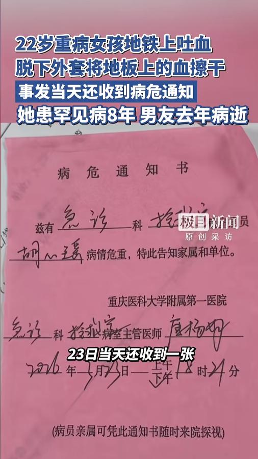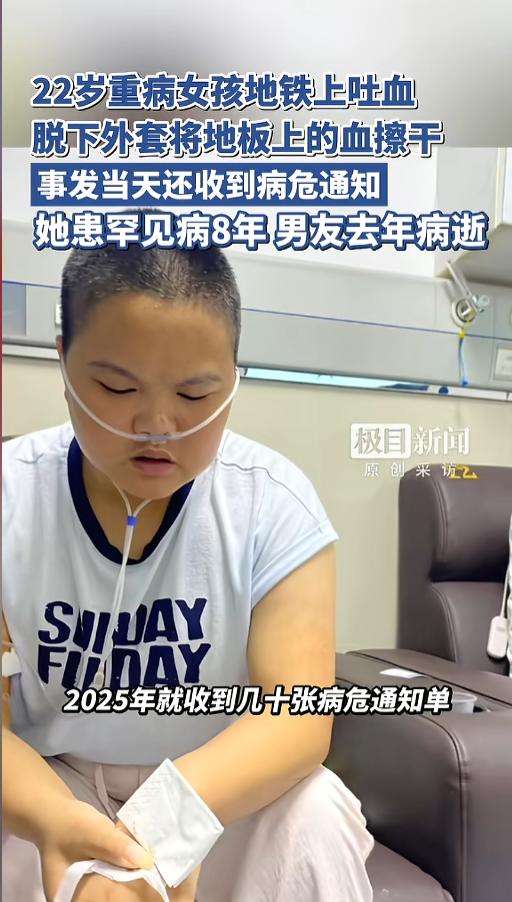 “看哭了!”3月23日,重庆,一女孩乘地铁去医院,路途中身体不适,吐了大片的血。她身上也没有带卫生纸,还是强忍着不适,脱下外套,把血擦了干净。她患罕见病8年,经济困难无法进行系统治疗,男朋友也先一步病逝!网友:懂事的让人心疼! 据媒体报道,女孩今年才22岁,2018年的时候,确诊了一种罕见病,ANCA血管炎,随后又发展成了肾衰竭,各种并发症不断。因为经济困难,父母年迈待在老家,她无法接受系统性的治疗,身边也没人照顾,只能自己照顾自己,一个人去医院。 最近一段时间,女孩的症状更严重了,每天都得去医院输液。当天,她正在去医院的路上,因为没忍住,在地铁上吐了血。 她身上没有卫生纸,又担心血吓到别人,或者被人踩到,弄脏了别人的鞋子,就强忍着不适,脱下了自己最喜欢的外套,蹲在地上,用它把地上的血擦了起来。因为身体太虚,擦得时候还歇了一阵儿。 因为这个病,女孩儿两次拒绝了男友的求婚,没想到,男友也患了重病,去年的时候离世了,去世前还专门托人给女孩儿转了一笔钱,希望她能够好好治疗。可女孩儿已经收到了很多次病危通知书,事发当天,她又收到了一张。 网友看后表示,麻绳专拣细处断,厄运偏挑苦命人,多么懂事的女孩儿,怎么命运就这么不公呢?希望她能走出伤病的阴霾,迎来康复的曙光!祝愿她早日恢复健康,拥抱美好的生活! 信息来源:《22岁重病女孩地铁上吐血,脱下外套将地板上的血擦干,事发当天还收到病危通知,她患罕见病8年,男友去年病逝》极目新闻