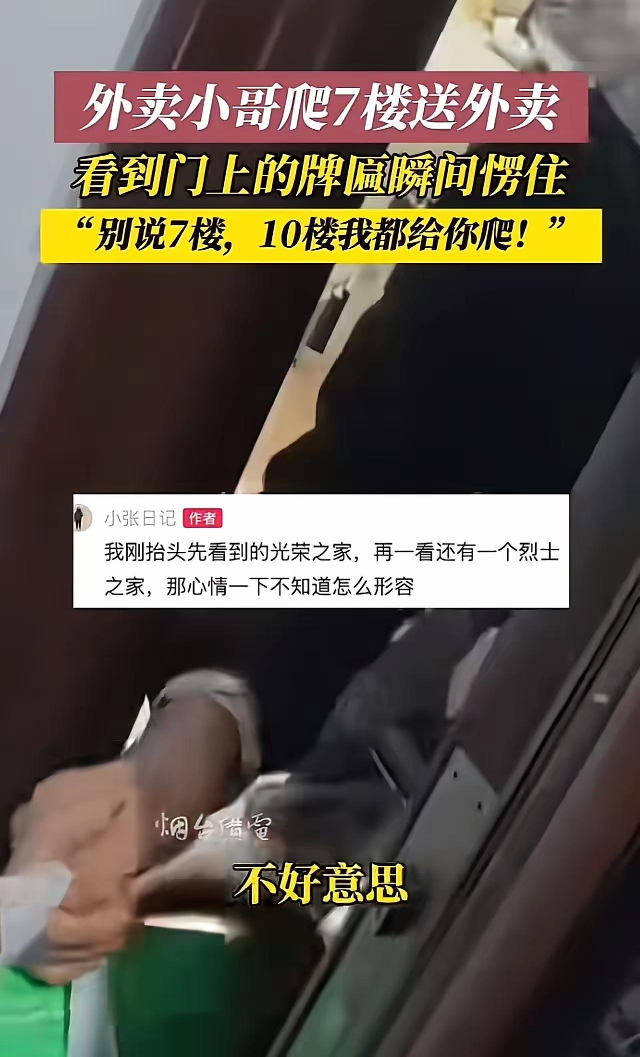 这段视频里最戳人的,从来不是爬几层楼,而是一块小小的光荣牌,藏着一家人的奉献与坚守。 外卖小哥本来还在为爬七楼郁闷,抬头看见门口“光荣之家”的牌匾,瞬间肃然起敬、红了眼眶。一句“别说7楼,10楼我都爬”,道尽了普通人对军人、军属最朴素的敬意。 网友说“这牌匾是荣誉,更是心酸”,一点没错。光荣之家的背后,是有人保家卫国、远离亲人,是家人默默扛起生活、独自守候。一块牌子,扛着家国,也装着牵挂。 正是这些默默付出的家庭,才撑起了我们安稳的日常。多一份理解,多一份敬重,就是对他们最好的回应。 素材取于网络