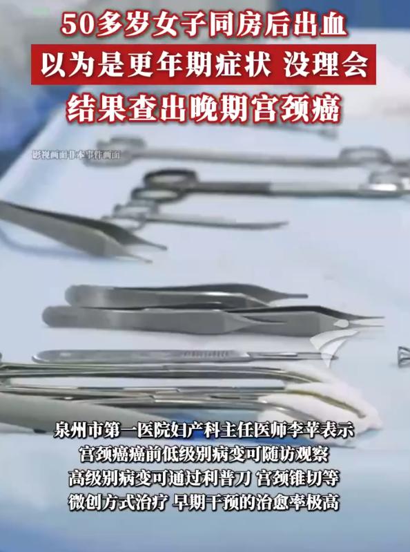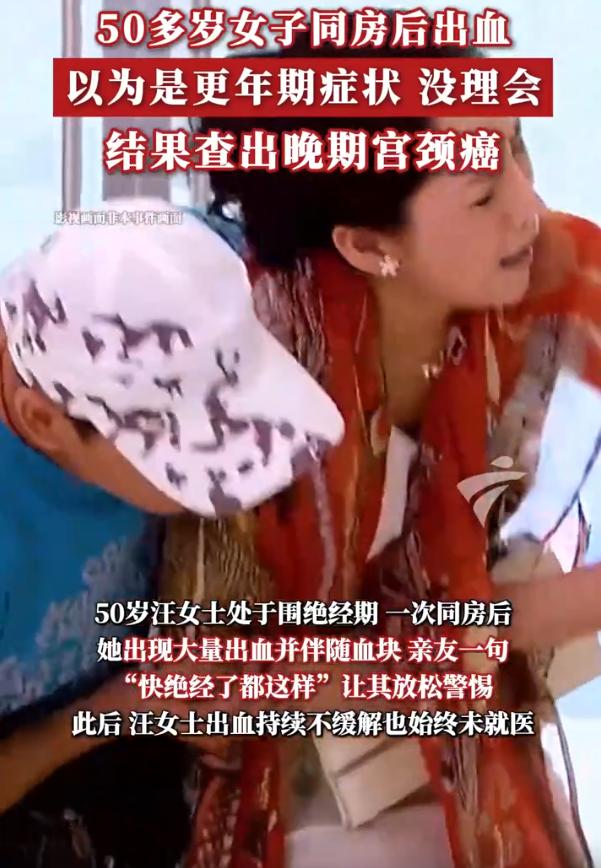 福建泉州,一名50岁女子在一次同房后突然大量出血并带有血块,女子觉得不太对劲,就询问了一位亲戚,可对方听后却不以为然,回了句“快绝经都这样”,女子也就不在意了, 可后来问题严重,她去医院一检查,被告知是晚期宫颈癌 事情要从一次同房说起。那天之后,她突然发现下面出了很多血,还带着血块,量挺大的。女人到了这个年纪,身体有点风吹草动本来就容易多想,她觉得不太对劲,心里犯嘀咕,就去找了一个亲戚问 亲戚听完,特别不以为然地来了一句:快绝经了都这样,别大惊小怪的 这话听起来是不是特别耳熟?很多女性在身体出现异常的时候,第一个求助的对象往往不是医生,而是身边“有经验”的过来人。一句“正常”,就把所有的警惕心都给卸掉了 汪女士信了。她想,可能真是这样吧,毕竟自己也快绝经了。于是就没再当回事,也没去医院 可问题是,出血并没有停。断断续续一直没见好,甚至还越来越严重。直到有一天,血量大到她实在扛不住了,这才去了医院 检查结果出来,她的宫颈上长了一个4到5公分的巨大肿物,确诊是宫颈癌,而且已经是晚期了 一个可以早期发现、早期干预的病,就这样在“快绝经都这样”这句话里,被硬生生拖到了晚期 如果你身边有女性朋友、家人,跟你说起身体有什么异常,别急着用“我当年也这样”来安慰她。你不经意的一句话,可能就让她错过了最佳的就医时机。正确的做法是告诉她:这事儿得让医生看,我陪你去 这不是小题大做,这是对自己和他人真正的负责