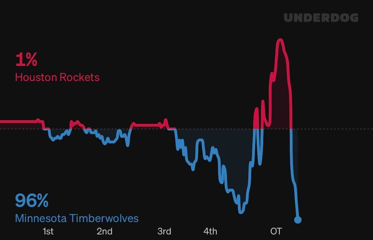 没有爱德华兹,森林狼今天就用8个人,然后杰登伤退、戈贝尔罚下、里德驱逐,就剩五个人(后来上了2分钟香农),加时赛最后三分钟落后13分,然后…赢,赢了?!