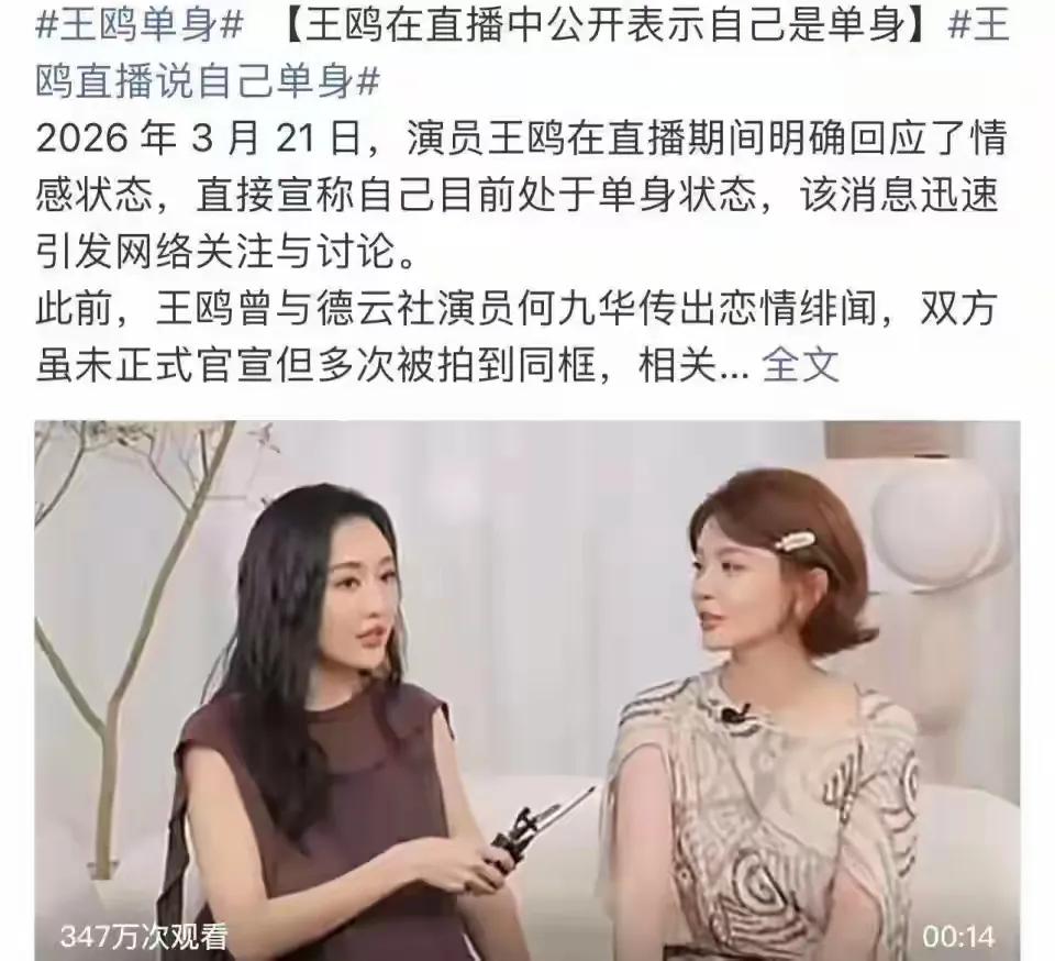 王鸥大方宣布单身,传了五年的绯闻,终于在直播间亲口终结了 传了挺久的绯闻,王鸥在直播间里给了个利落的回应。3月21日,她提到自己现在单身,觉得一个人也挺自在,不用总为谁牵肠挂肚。有意思的是,就在二月,还有媒体拍到她和前绯闻对象同框,但到了三月,她亲自把这事儿说清楚了。 这两年,王鸥的工作排得挺满。去年一口气拍了六部戏,还忙着录综艺、做自己的品牌。之前有次她带着一个小女孩出门,被网友猜测,后来工作室也澄清是亲戚的孩子。在这么满的节奏里,她露面时的状态依然在线,看着挺从容。 感情的事,外人其实很难说清。但她能大大方方把现状摊开,不解释细节,也不提对方,这种态度本身就挺坦荡的。看她现在专注工作、生活充实的样子,其实比任何回应都更有说服力。一个人过得好不好,自己最清楚,旁人的猜测,也就随它去吧。