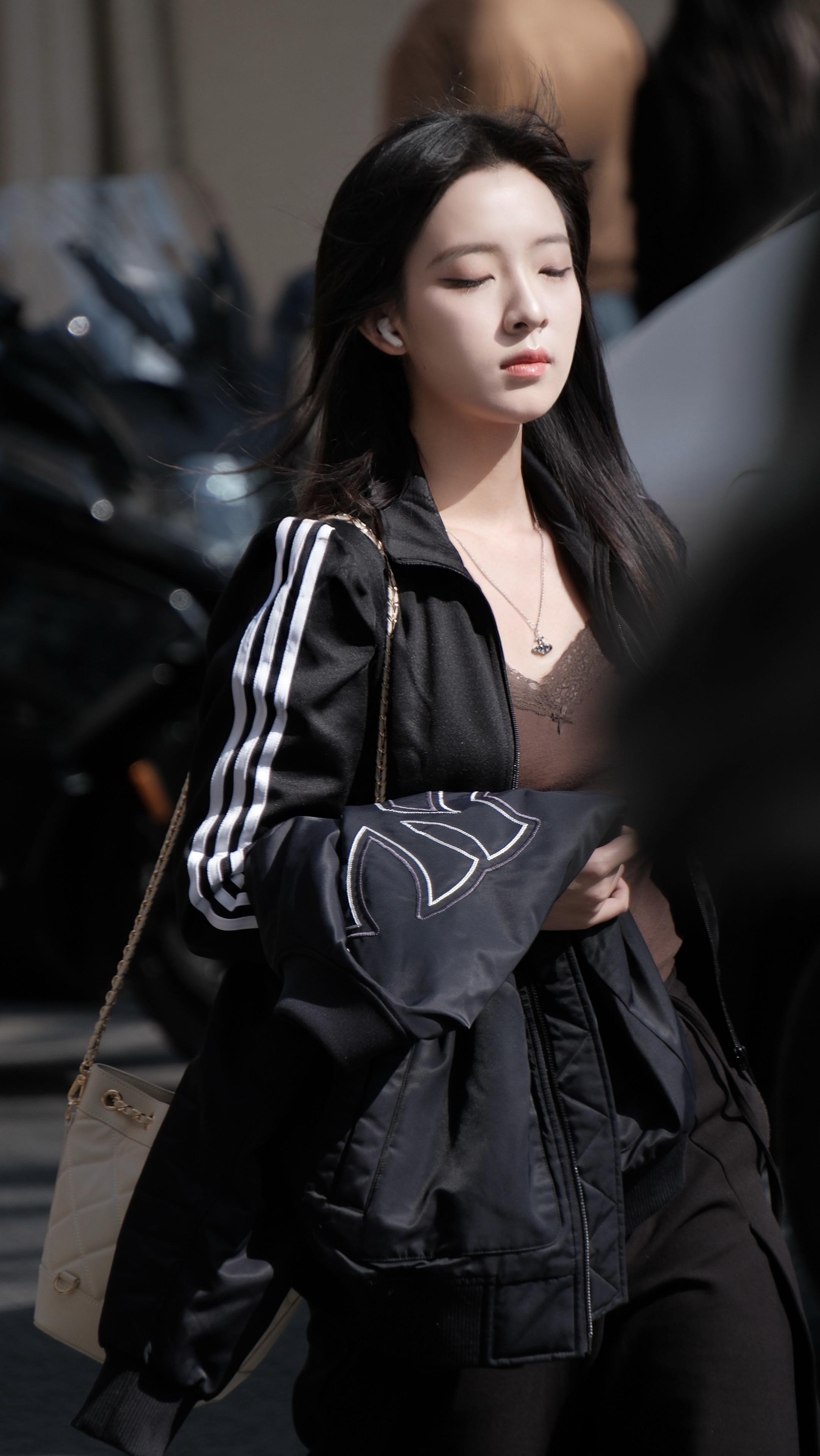 曾黎这状态真的绝了✨机场街拍一身黑皮衬衫+工装牛仔裤,又酷又飒,红色流苏耳坠一