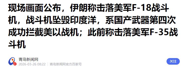 美军最不愿看到的事发生:又一架战机被击中,仓皇往航母方向跑 最近,美军最不愿看到的事还是发生了,伊朗再次斩获新的战果,继之前成功击中美军的F-35、F-16I和F-15战斗机之后,这一次,又有一架美军的F-18战斗机被击中,战机被击中后仓皇往航母方向逃跑,最终没跑多远就坠入了印度洋。 这件事发生在3月25日下午,地点就在伊朗东南部恰巴哈尔附近的领空。熟悉情况的人都知道,美军这些年一直在中东地区耀武扬威,经常派遣战机闯入其他国家的领空,进行侦察和挑衅,伊朗的领空也没能幸免。 这次被击中的F-18战斗机,就是美军擅自闯入伊朗领空的战机,大概率还是想像以前一样,搞点小动作,测试伊朗的反应,搜集相关数据,没想到这次彻底栽了跟头。 更让美军没面子的是,这次击中美军战机的,并不是伊朗革命卫队的正规部队,而是伊朗的巴斯基民兵。 可能很多中老年人不知道巴斯基民兵是什么,简单说,这是伊朗革命卫队旗下的一支志愿民兵组织,成员大多是普通平民,平时和正常人一样生活、工作,遇到紧急情况就会投入行动,人数很多,动员起来很方便,而且他们经过简单培训,就能操作一些简易的武器装备。 这次巴斯基民兵使用的是肩扛式防空导弹,这种导弹不用复杂的设备,一个人就能携带、操作,瞄准目标后就能发射,操作起来很简单,非常适合民兵使用。 当时,这架美军F-18战机正在伊朗领空低空飞行,可能是太轻敌了,根本没注意到地面上的巴斯基民兵。 巴斯基民兵发现这架战机后,没有丝毫犹豫,迅速拿出肩扛导弹,瞄准战机、扣动扳机,导弹直接命中了F-18战机的机身。 被击中后,F-18战机瞬间冒出滚滚黑烟,飞行轨迹开始失控,机身摇摇晃晃,显然已经无法正常飞行。 战机上的飞行员吓得魂飞魄散,根本顾不上继续执行任务,赶紧操控战机,拼尽全力往美军航母的方向逃跑,只想赶紧回到航母上保住性命。 可导弹的威力不小,战机受损严重,飞行速度越来越慢,还没飞到航母附近,就失去了所有控制,一头坠入了印度洋,彻底坠毁了。 这件事可不是伊朗随口说的,伊朗方面还发布了地面拍摄的完整视频,视频里清清楚楚地记录了整个过程。从巴斯基民兵发现战机、拿出导弹,到瞄准、发射,再到导弹击中战机、战机冒烟坠毁,每一个细节都看得明明白白,没有一点虚假,铁证如山,根本容不得美军抵赖。 其实,这已经不是伊朗方面第一次击中美军战机了。之前,伊朗就已经成功击中过美军的F-35、F-16I和F-15三种型号的战斗机,每一次都让美军颜面尽失。 尤其是之前击中的F-35战机,还是美军号称“不可战胜”的隐形战机,当时伊朗议长还表示,F-35是美军傲慢的象征,这次被击中,也打破了美军战机不可战胜的神话。 美军这次之所以会栽跟头,最主要的原因就是太轻敌了。他们一直觉得自己的战机性能先进,伊朗的防空力量不值一提,所以频繁派遣战机闯入伊朗领空,丝毫没有把伊朗的防御放在眼里。 他们以为,伊朗的民兵手里的简易武器,根本伤不到他们的先进战机,可没想到,巴斯基民兵用一把简单的肩扛导弹,就把他们的F-18战机打了下来,让他们颜面扫地。 截至目前,美军官方还没有对这件事做出明确回应,既没有承认战机被击中,也没有否认,这种沉默反而更能说明他们的尴尬和狼狈。 美军一向爱面子,要是承认自己的战机被伊朗的民兵用肩扛导弹打下来,就等于承认自己的先进战机不堪一击,丢尽脸面;可要是否认,伊朗公布的视频摆在那里,根本无法抵赖,只能选择沉默,进退两难。 这件事虽然只是一次简单的空中交锋,但也能看出,美军在中东的威慑力已经大不如前,而伊朗的实力却在不断提升。 这些年,美国一直联合盟友打压伊朗,实施经济制裁和军事封锁,试图逼迫伊朗低头妥协,可伊朗从来没有屈服,反而不断提升自己的军事力量,用实际行动捍卫自己的国家主权和领土完整。 美军总想着在别人的家门口搞挑衅,测试别人的底线,可这次,他们终于尝到了轻敌的滋味。伊朗用实际行动告诉美军,不管是正规部队还是民兵,只要美军敢闯入伊朗的领空,挑衅伊朗的主权,就一定会遭到坚决反击,付出应有的代价。 以前美军在中东横行霸道,想欺负谁就欺负谁,可现在,伊朗一次次用战绩证明,霸权主义并不是不可战胜的,任何国家只要有决心、有实力,就能守护好自己的家园。 而且,这件事也让全世界看到,美军并不是不可战胜的,他们的先进装备也有弱点。巴斯基民兵只是一支民兵组织,手里的武器也只是简易的肩扛导弹,就能击中美军的主力战机,这也说明,美军的战机并不是像他们宣传的那样“无敌”。