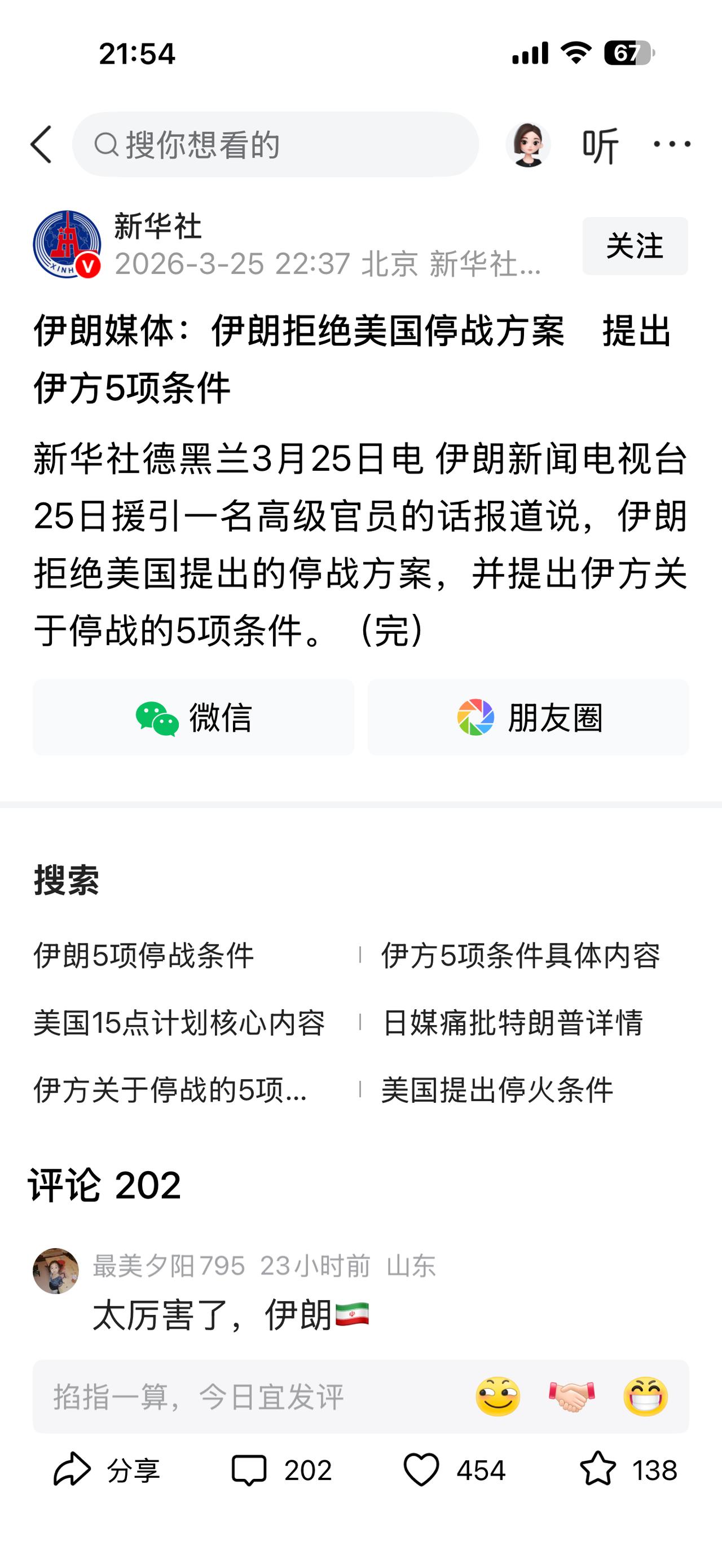 伊朗提出和谈“5条”,否定了特朗普的“15条”这是预料之中的事情。只是,在这次冲突中伊朗比想象中坚持得更久! 首先,伊朗的导弹、远程无人机应该是清空库存了;其次,主要领导集体被“团灭”,其抵抗的意志和组织性大大降低;最后,面对美国海军陆战队准备登陆哈尔克岛,切断伊朗90%以上的石油输出,伊朗的财政收入将降低60%左右。 面对美国和以色列的常规武器轰炸,世界上除了中国、俄罗斯(因为国土面积大)没有第三个国家能扛住。 伊朗能坚持到现在,已经算尽力了!但愿早点结束冲突,油价跌下来国内的车主也能少花点钱!