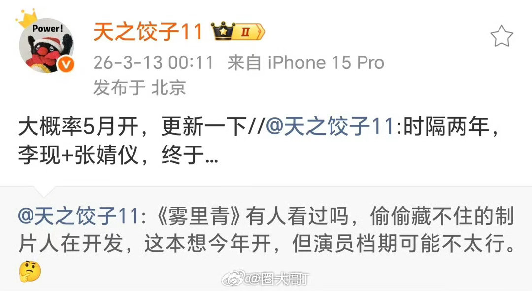 网传雾里青暂定5月1日开机李现张婧仪主演的电视剧《雾里青》暂定5月开机,男女主造型是嘉人团队,李现和张婧仪的cp感还挺多人嗑的。和《难哄》一个导演,隔着屏幕都能感受到的氛围感,侯燥开机啦~曝李现张婧仪雾里青5月开机