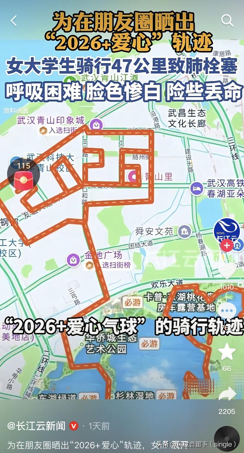 为了画个“2026+爱心”,差点没命了! 武汉一个女大学生,为了在朋友圈晒出“2026+爱心”轨迹,骑行了47公里,导致肺栓塞,差点把命要了! 这女大学生估计初心就是想给自己在2026年有一个好的祝愿,于是就骑了个这形状,没想到骑了47公里就导致肺栓塞,呼吸困难、脸色惨白,差点把命丢了! 所以不管骑行还是其他户外运动,一定要注意安全,要时刻注意自己身体情况,不能为了一些小事把自己累垮了,或者导致自己身体受伤! 其实要说这个轨迹图真的漂亮!