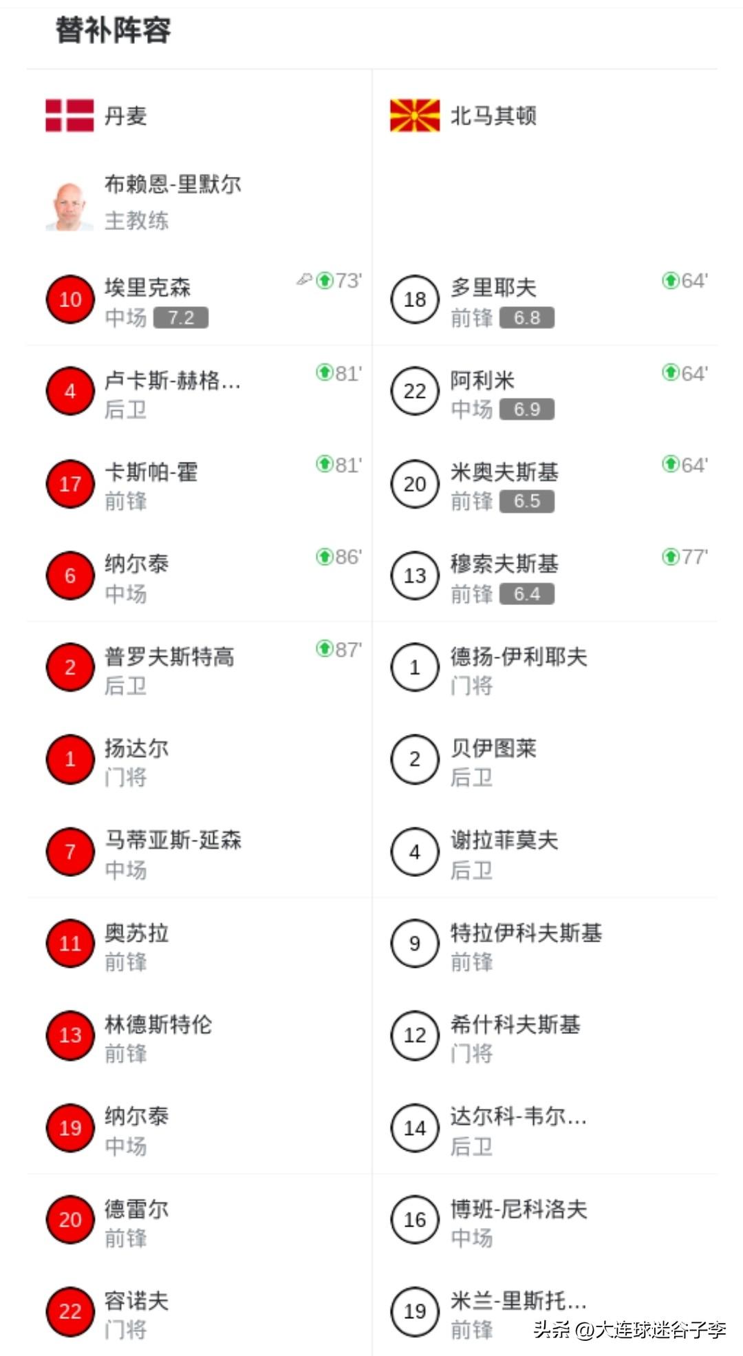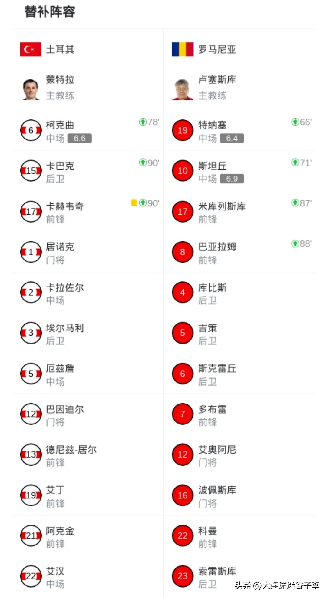 大连英博俩外援出战世预赛 在今天凌晨结束的世界杯欧洲区预选赛附加赛半决赛的两场比赛中,罗马尼亚队0-1不敌土耳其,大连英博队外援斯坦丘第71分钟替补出场。 另外一场比赛,北马其顿0-4不敌丹麦,大连英博队外援阿利米在第64分钟替补出场。 除了斯坦丘和阿利米之外,罗马尼亚队的中后布尔克此役首发出场,他目前效力于中超云南玉昆队。 另外两场附加赛中,意大利2-0北爱尔兰,波兰2-1阿尔巴尼亚。