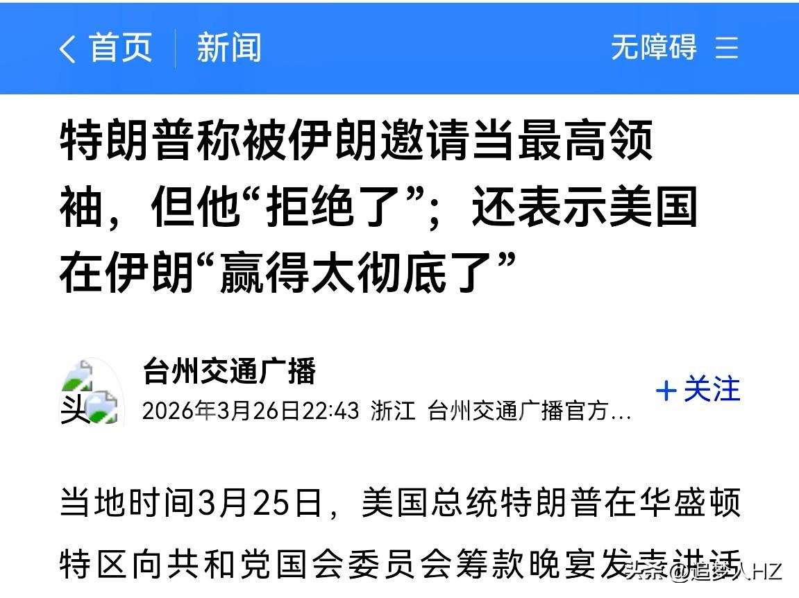特朗普称伊朗提议让他担任新一任最高领袖(即“新阿亚图拉”)。 这番“惊人之语”,难道特朗普符合“什叶派宗教学者”这一基本门槛。 特朗普是长老会(Presbyterian)信徒,家庭背景为长老会。 更可笑的是他还拒绝担任伊朗最高领袖,还调侃从没有一个国家领导人比我更不想当伊朗的头儿。 这都哪跟哪啊!编瞎话也太离谱了吧!两国交战美国袭击伊朗,纯粹的死对头,怎么让一个敌对国家领导人来当最高领袖。 个人觉得,特朗普还是好好面对“法特瓦”(宗教裁决)“追杀令”,别在一天天搞笑,保命要紧啊! 国际观察今日热点 追梦人HZ