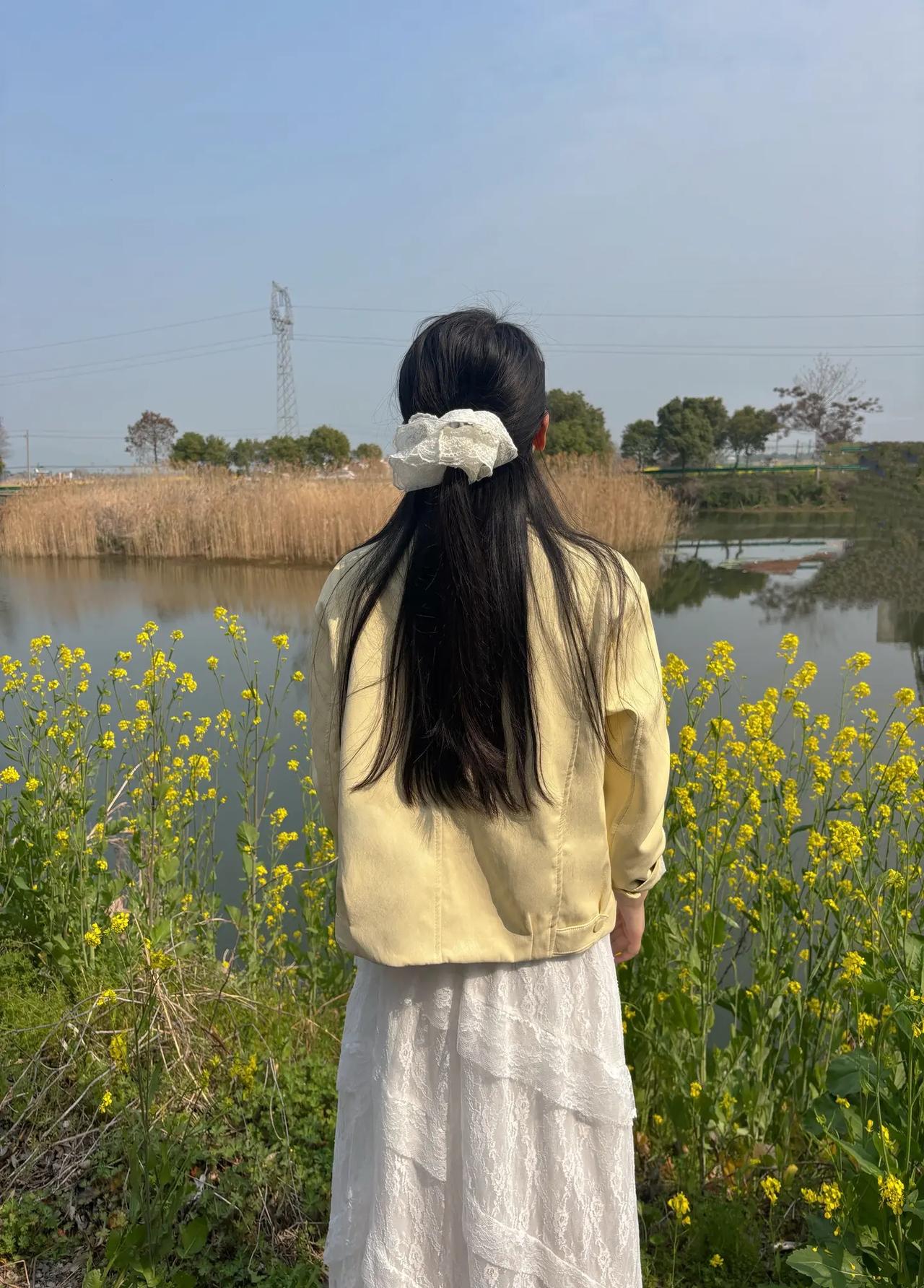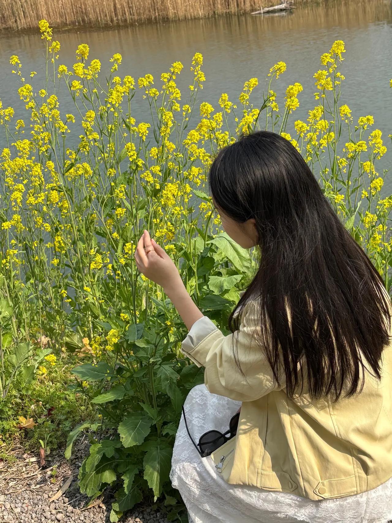 春日漫步,花海中的少女与湖畔的宁静