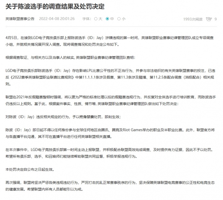 这是LPL联盟近年来对涉嫌假赛选手的最严重罚单,是近年LPL第二位被全球禁赛的选手。