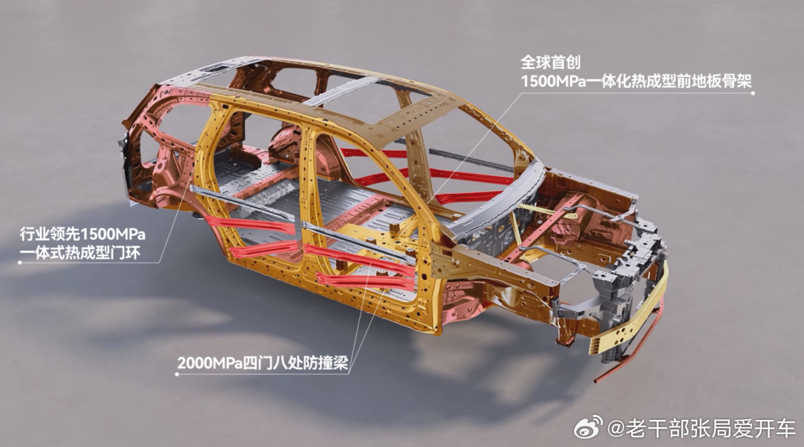 针对侧面撞击的薄弱环节,华境S采用了与宝钢共创的1500MPa一体式热成型前地板骨架,以及1500MPa一体式热成型门环,搭配十宫格结构的挤压铝门槛加强梁,同时在四门八处增设2000MPa车门防撞梁。在此超高强钢材质和一体式结构基础上,华境S进一步采用五纵十一横六环笼式车身结构,提升高速单点暴力冲击和多维扭曲力下的车身框架的完整性与电池包安全。