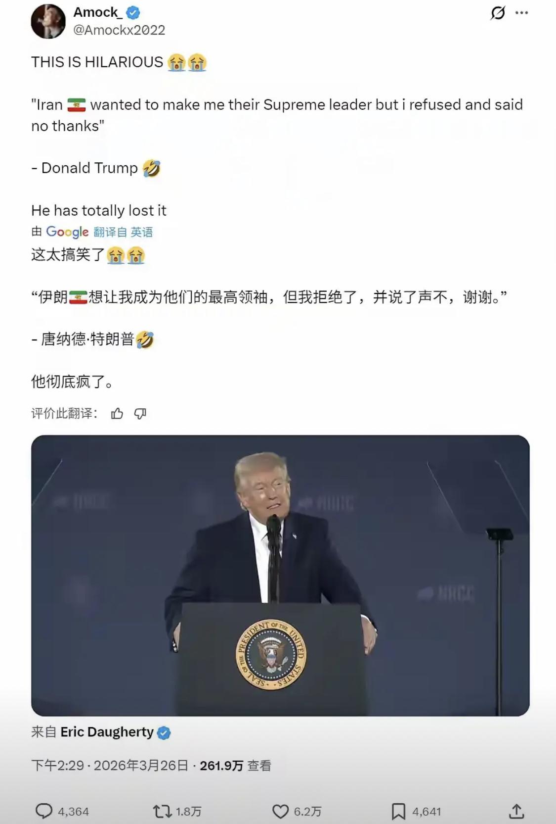 真是彻底疯了! 特朗普现在说话都不经过大脑了吗,近日特朗普在演讲中又再一次语出惊人,他竟然说伊朗人想让他成为伊朗的最高领袖,但是被他给拒绝了。 这话如果不是从特朗普嘴里说出来,我以为是哪个脱口秀演员的段子。 3月26日,特朗普在佛罗里达的竞选集会上对着台下的人说:伊朗人民给我写信,求我去当他们的最高领袖,但是我拒绝了。然后他摊开双手,一脸“我做了件好事但我不说”的表情。 台下哄堂大笑。 如果伊朗人真有这个想法,过去35天为什么还要朝美军基地扔64轮导弹?如果特朗普真能当伊朗的领袖,拉里贾尼为什么还要被炸死在女儿家里?这逻辑,连小学生都绕不过去。 特朗普为什么说这话 先看时机。 3月26日,距离5月14日访华还有不到两个月。特朗普在中东打了35天,没打赢。在盟友圈喊了35天,没人跟。在国内经济上扛了35天,油价还在高位。这时候,他需要一剂强心针——不管真假,能博眼球就行。 “伊朗人请我去当领袖”——这话在懂王的世界里,是“我很受欢迎”的证据。他不在乎伊朗人怎么想,他在乎的是佛罗里达的选民怎么想。只要台下笑了,只要镜头拍了,只要媒体报了,这话就值了。 伊朗人怎么想 特朗普在台上说笑话的时候,德黑兰的街道上,拉里贾尼的遗像还没摘。 3月18日,数十万伊朗人为他送葬。3月27日,伊朗外长在联合国安理会说:“我们已被从地图上抹去。”那些失去亲人的人,听到特朗普说“伊朗人请我当领袖”,是什么感觉? 愤怒,还是可笑? 伊朗外交部发言人3月27日被问到这个问题时,只说了一句:“特朗普先生的言论,不值得回应。”不值得回应,是最狠的回应。因为他知道,这话说出去,全世界都会觉得好笑。伊朗人不需要反驳,只需要沉默,让这笑话自己飞一会儿。 这话是说给谁听的 特朗普这段话,至少有四个听众。 第一个是美国选民。他要告诉选民:我在全世界都受欢迎,连敌人都想让我当领袖。这是为选票包装自己。 第二个是国内的反对者。他要用这种“受欢迎”的叙事,对冲中东战事的负面新闻。打了35天,死了13个人,伤了200多,油价涨了45%,选民会骂他。但如果说“伊朗人请我当领袖”,选民可能会笑一笑,暂时忘掉油价。 第三个是国际社会。他要告诉全世界:不是我想打,是他们想让我管。这是为自己在中东的失败找台阶。 第四个是他自己。特朗普需要不断给自己打气。打了35天没打赢,盟友不跟,中国不接招,他能做的,只有在集会上讲个笑话,告诉自己:我还是很行的。 《史记》里有一句话:“天下熙熙,皆为利来;天下攘攘,皆为利往。”熙熙攘攘都是为了利益。特朗普的“笑话”,也是为了利益。只是这利益,是用伊朗人的血换来的。 从“应伊朗请求暂停”到“伊朗请我当领袖” 3月26日,特朗普说“伊朗人请我当领袖”。 3月26日,特朗普还说“应伊朗政府的请求,暂停打击能源设施”。 10天前是“伊朗求我停手”,10天后是“伊朗求我当领袖”。特朗普讲笑话的功力,比他的外交水平高多了。 但从这两个“笑话”里,能看出一个趋势——特朗普正在把伊朗问题,从“军事失败”包装成“政治胜利”。我打不赢你,但我可以说你求我;我当不了你领袖,但我可以说你想让我当。这种“胜利”,是嘴上的胜利。 写在最后 3月27日,特朗普的笑话传遍全球。 德黑兰的街头,拉里贾尼的遗像还挂着。特拉维夫的防空洞里,民众还在数导弹。霍尔木兹海峡的油轮,还在绕道。油价还在高位,股市还在跌,日子还在紧巴着过。 特朗普在佛罗里达的讲台上,笑着说他拒绝了伊朗的最高领袖。 对此你怎么看?欢迎评论区聊聊。