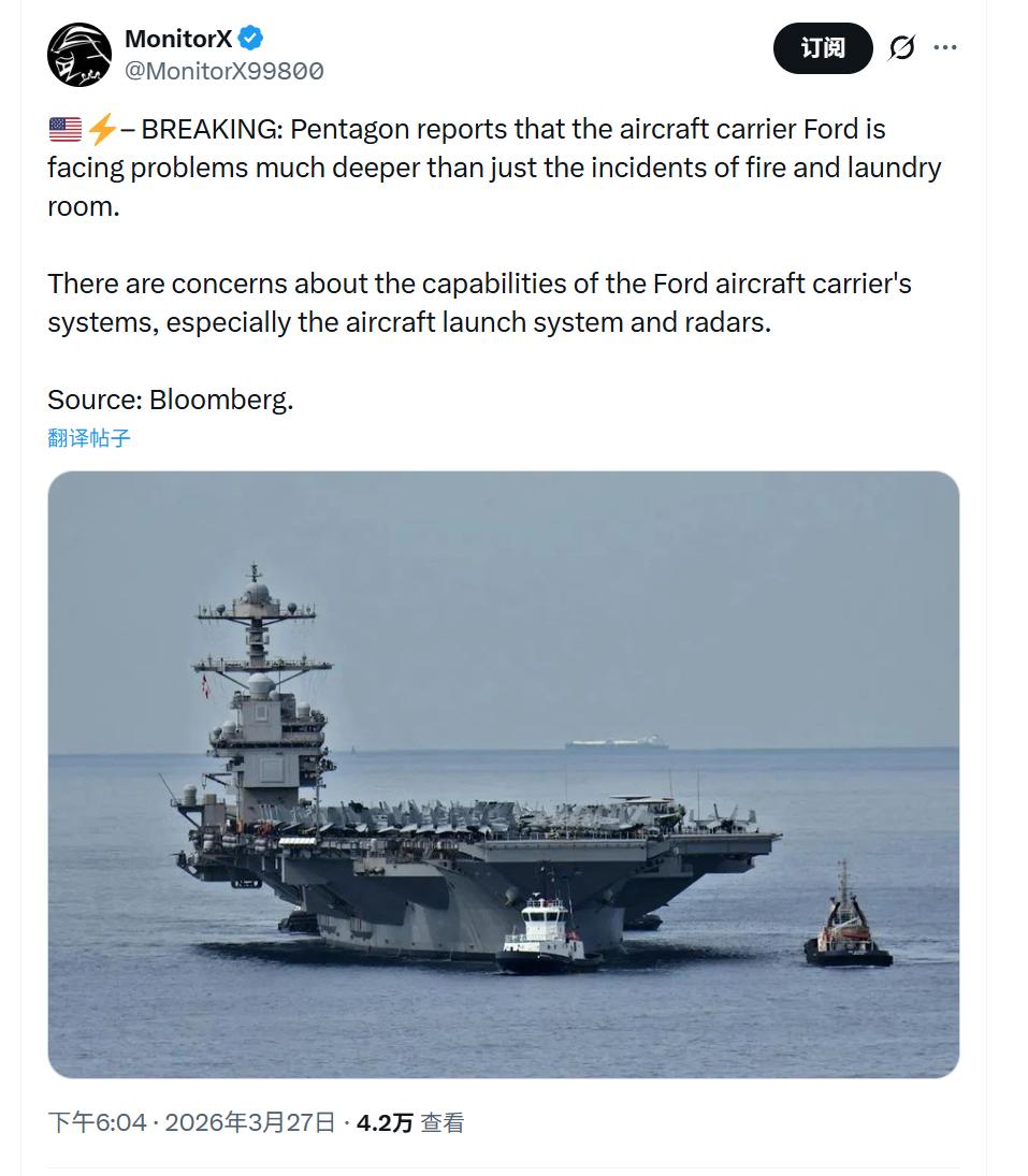 五角大楼报告称,“福特”号航空母舰面临的问题远比火灾和洗衣房事故要严重得多。人们对福特号航空母舰的系统能力表示担忧,特别是飞机弹射系统和雷达。 能被洗衣机和马桶击败,“福特”号也确实是让大家对美国航母的强大有了新的认识。