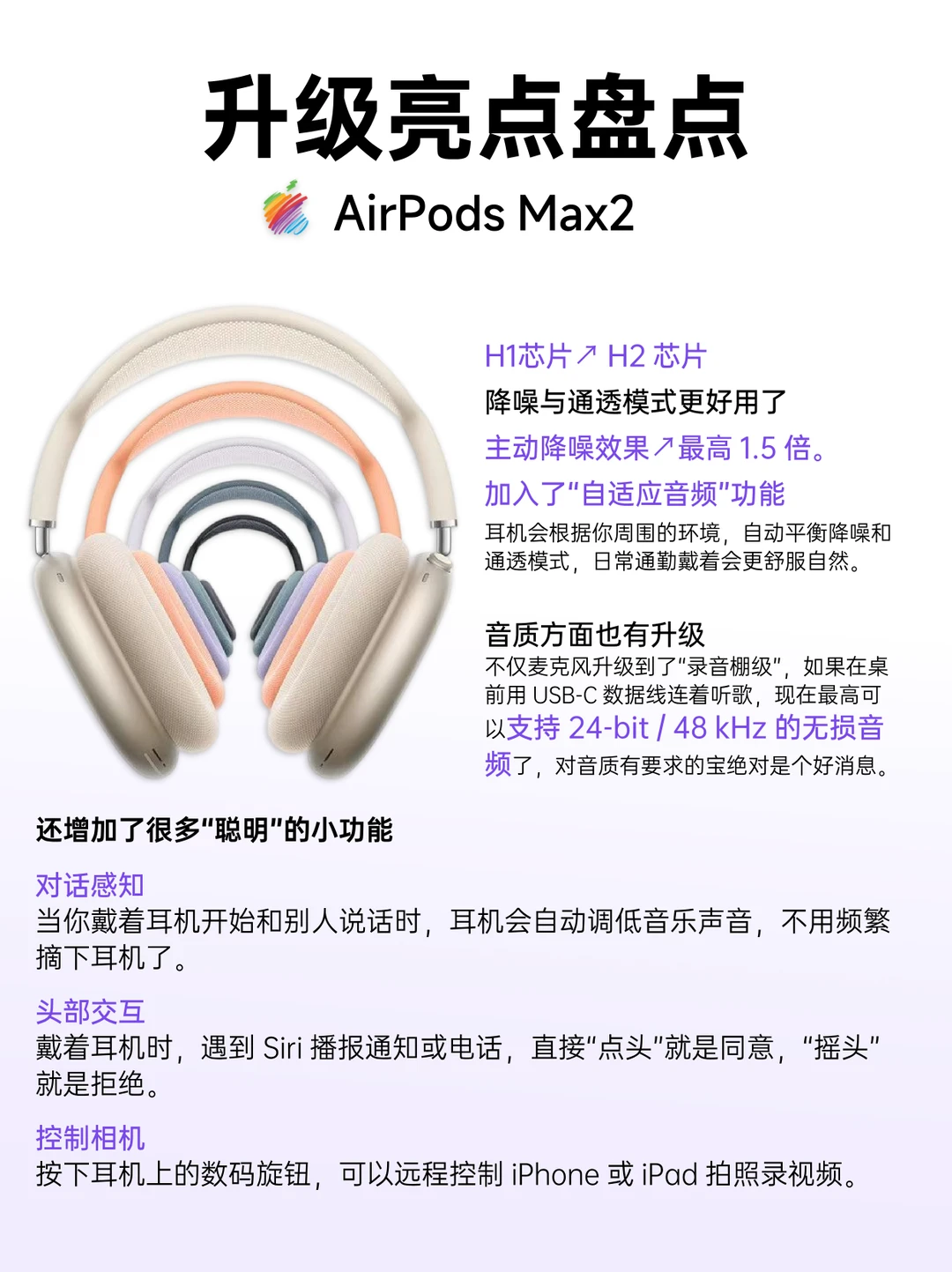下午好呀,我是娇娇[偷笑R]。 前天苹果通过新闻稿突然发布了第二代 AirPods Max,苹果确实很懂制造惊喜[开箱R]啊! AirPods Max 🆚 AirPods Max2有哪些升级亮点,一起来看一下吧 🔳其实这次二代最大的变化,就是把用了多年的老芯片,换成了目前最新的H2 芯片[烟花R] 有了这颗芯片的加入,下面这些体验上都提升了 1️⃣降噪与通透模式更好用了 官方数据说,主动降噪效果比初代提升了最高 1.5 倍。同时加入了“自适应音频”功能,耳机会根据你周围的环境,自动平衡降噪和通透模式,日常通勤戴着会更舒服自然。 . 2️⃣增加了很多“聪明”的小功能 🔸对话感知:这个在办公室或者咖啡厅很实用。当你戴着耳机开始和别人说话时,耳机会自动调低音乐声音,不用频繁摘下耳机了。 🔸头部交互:戴着耳机时,遇到 Siri 播报通知或电话,直接“点头”就是同意,“摇头”就是拒绝。 🔸控制相机:按下耳机上的数码旋钮,可以远程控制 iPhone 或 iPad 拍照录视频。 . 3️⃣音质与收音的小幅提升 不仅麦克风升级到了“录音棚级”,如果在桌前用 USB-C 数据线连着听歌,现在最高可以支持 24-bit / 48 kHz 的无损音频了,对音质有要求的宝算是个好消息啦~ _ ☁️ 哪些地方没有变? 🎧外观与重量: 尺寸、重量和初代完全一样,依然是那个有点分量的金属质感。 💰价格:保持 3999 元不变。(3月25日开启订购,下月初发售) 🎨颜色与接口:依然是5个颜色(午夜色、星光色、橙色、紫色和蓝色),接口延续了 24 年改款后的 USB-C。 💡选购建议 这其实是一次“补齐短板”的常规更新,把耳机拉回了目前苹果生态应有的体验水准。 如果你已经有一代,不用考虑换新。因为外观和佩戴感受完全一样,目前的升级点主要集中在软件算法上,一代的体验应对日常已经足够了,没必要花这份钱。 如果你正打算买第一台:那二代目前是首选。H2 芯片配合 Type-C 接口,能让你用得很省心,新出的星光色和午夜色也很好搭配衣服。 等待 AirPods Max 二代已久的宝子们,对于这次更新是否满意呀?👀
