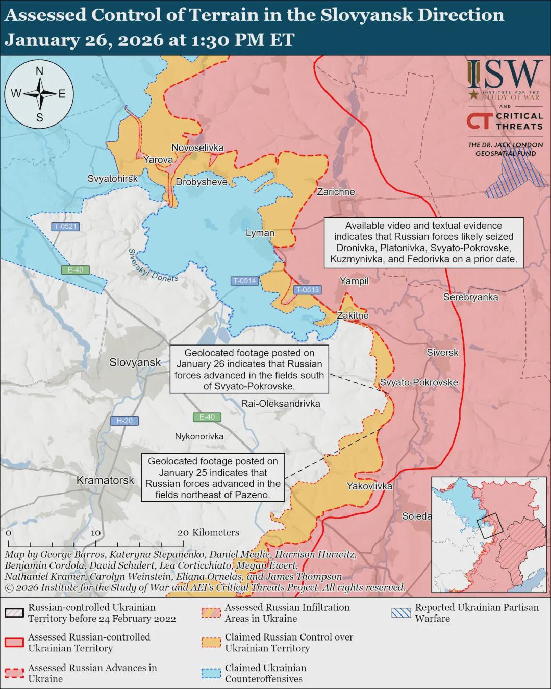 乌克兰军方消息人士1月20日和23日发布的地图显示,俄军此前已占领普拉托尼夫卡(斯拉维扬斯克以东)和德罗尼夫卡(斯拉维扬斯克东北部),并在扎基特内(斯拉维扬斯克以东)西部推进