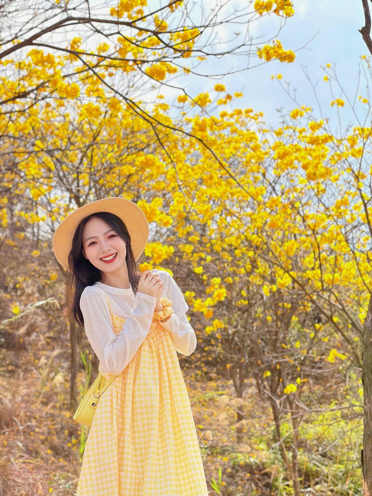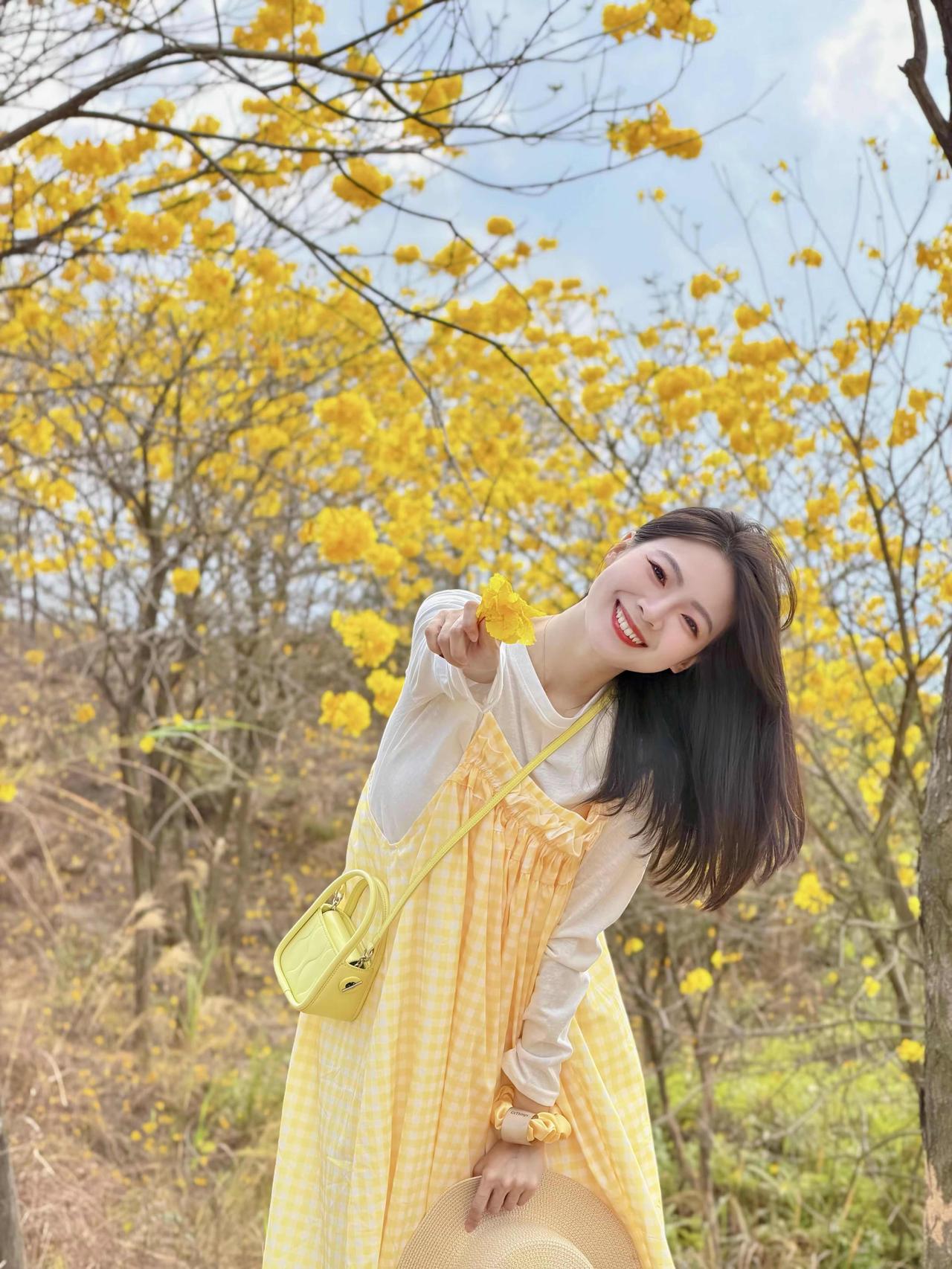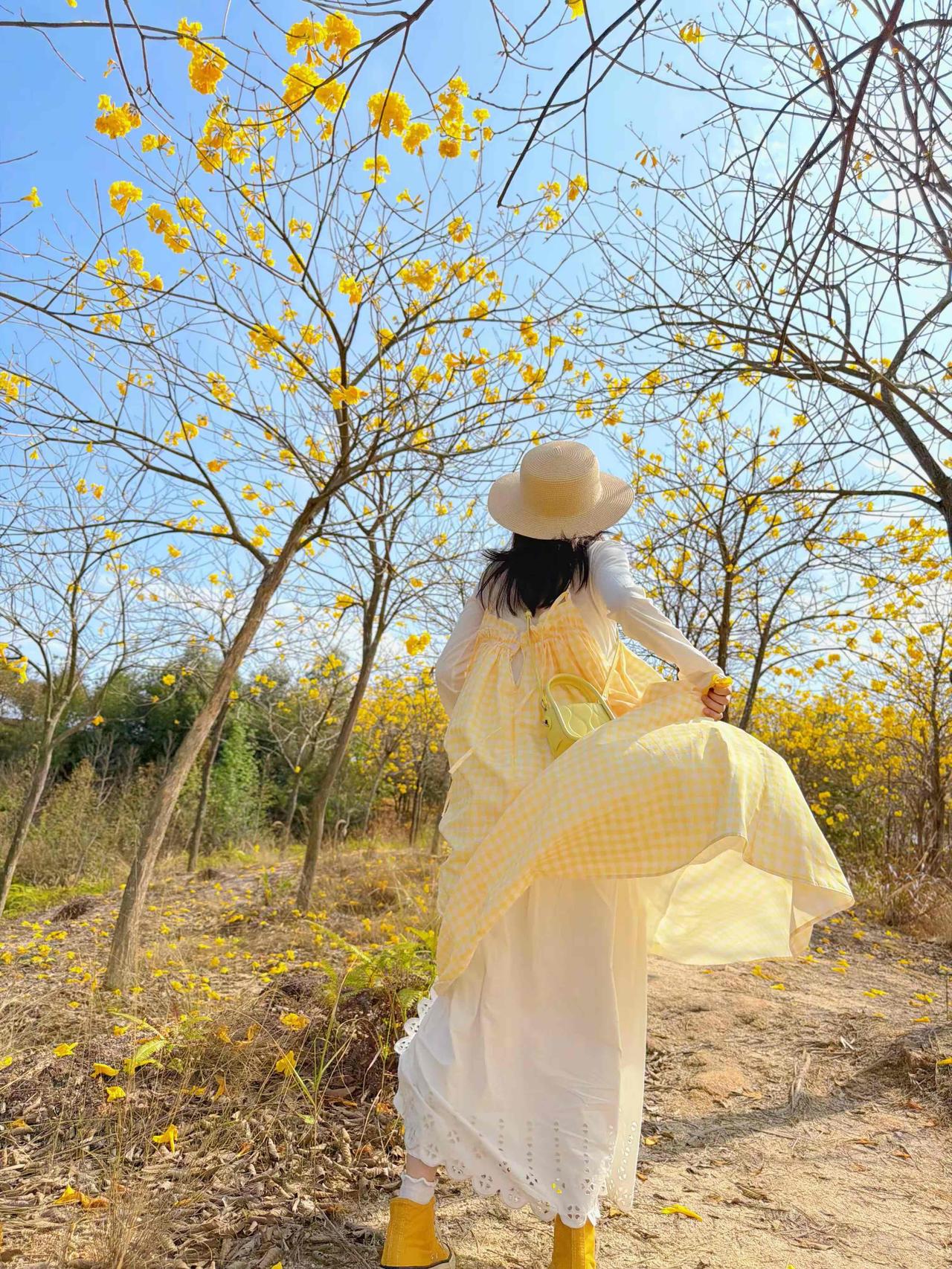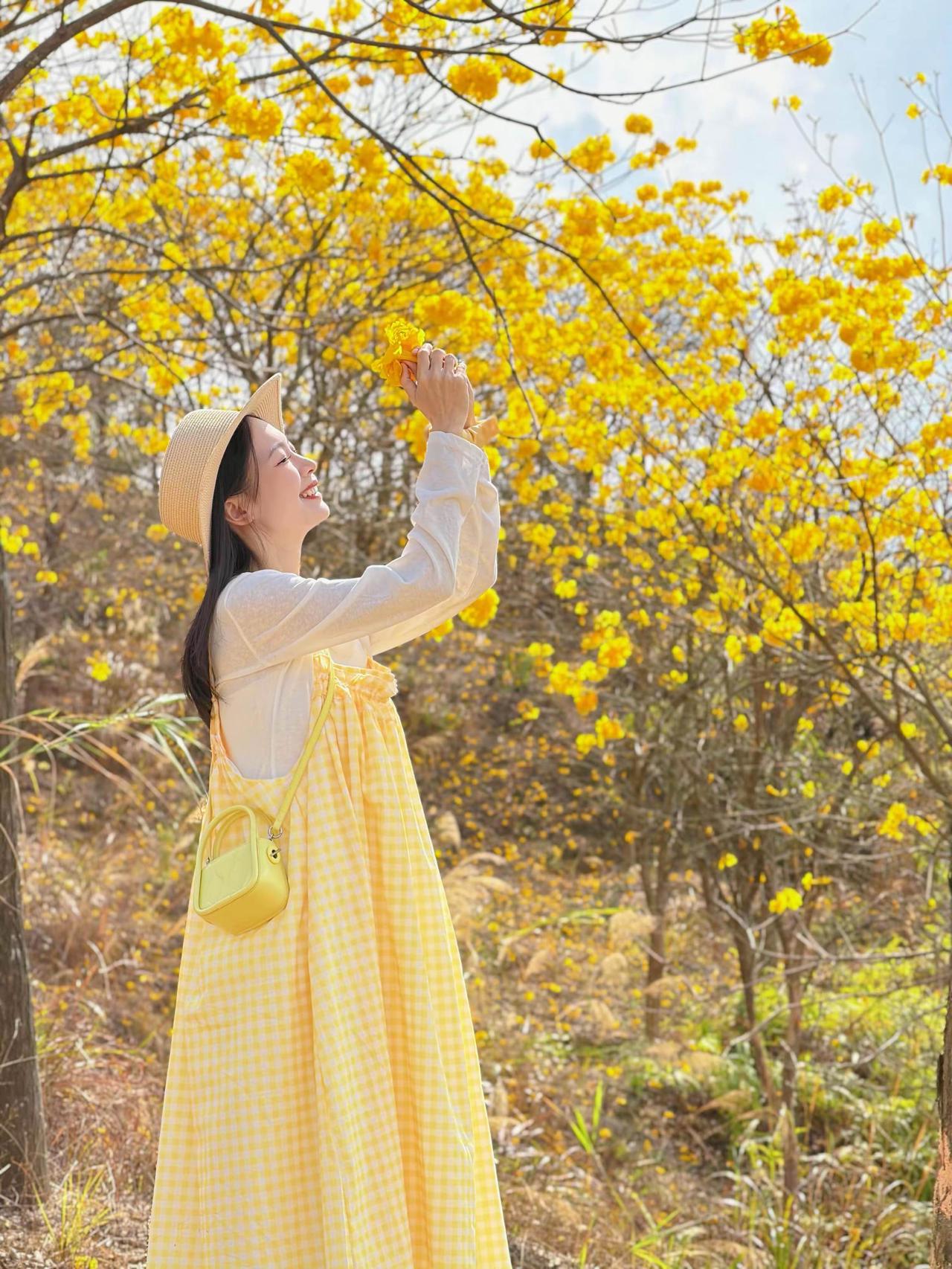 🌿 春日黄花风铃木森系穿搭 这套穿搭是黄花风铃木花海出游、森系野餐、户外踏青的满分穿搭,以黄白格纹为主角,完美融入春日金黄花海,氛围感与出片率双双拉满。 ✨ 核心单品解析 叠穿层次 • 内搭:米白色镂空花边长袖T恤 ◦ 软糯棉质亲肤透气,米白底色干净百搭,下摆镂空花边增添少女感,长袖设计应对户外微风,温柔又防晒。 • 外搭:黄白格纹吊带连衣裙 ◦ 春日专属的黄白格纹,与背景黄花风铃木形成色彩呼应,上镜自带元气滤镜;宽松吊带版型+抽褶细节,藏肉显瘦,营造松弛的森系少女感。 点睛配饰 • 草编渔夫帽:与森系场景完美融合,遮阳同时增添法式田园风,是户外拍照的氛围感神器。 • 亮黄色迷你斜挎包:小方包设计精致小巧,亮黄色提亮整体造型,与格纹裙、花海形成色彩呼应,吸睛不突兀。 • 黄色发圈/头花:细节感拉满,与花海场景融为一体,甜妹气质十足。 鞋履 • 黄色简约帆布鞋:与包包、格纹裙形成同色系闭环,舒适百搭,适合长时间户外行走,完美契合休闲出游场景。 🌟 风格亮点 1. 完美融入场景:黄白格纹与金黄花海、蓝天背景形成撞色,既不淹没在景色中,又和谐统一,是妥妥的“春日氛围穿搭”。 2. 松弛感少女风:宽松连衣裙+休闲内搭,无束缚感,搭配草编帽和帆布鞋,打造自然不做作的森系少女感。 3. 显白提气色:明亮的黄色系自带阳光感,完美衬托肤色,笑容更有感染力,拍照自带柔光滤镜。 💡 搭配延伸 • 更休闲:换白色帆布鞋+棒球帽,弱化裙装的柔美,打造元气休闲风。 • 更保暖:外搭米色针织开衫,应对春日早晚微凉,延续温柔气质。 • 更甜美:搭配黄色系发箍/发带,强化甜妹属性,适配野餐、闺蜜合照场景。 📸 场景适配 • 黄花风铃木花海:与成片金黄花树完美融合,是拍摄春日氛围感写真的首选穿搭。 • 户外野餐/踏青:舒适自在,适配草地、土路等多种户外地形,轻松出片。 • 闺蜜约会:清新甜美的风格与姐妹聚会场景高度契合,轻松成为朋友圈点赞收割机。 少女感 ootd