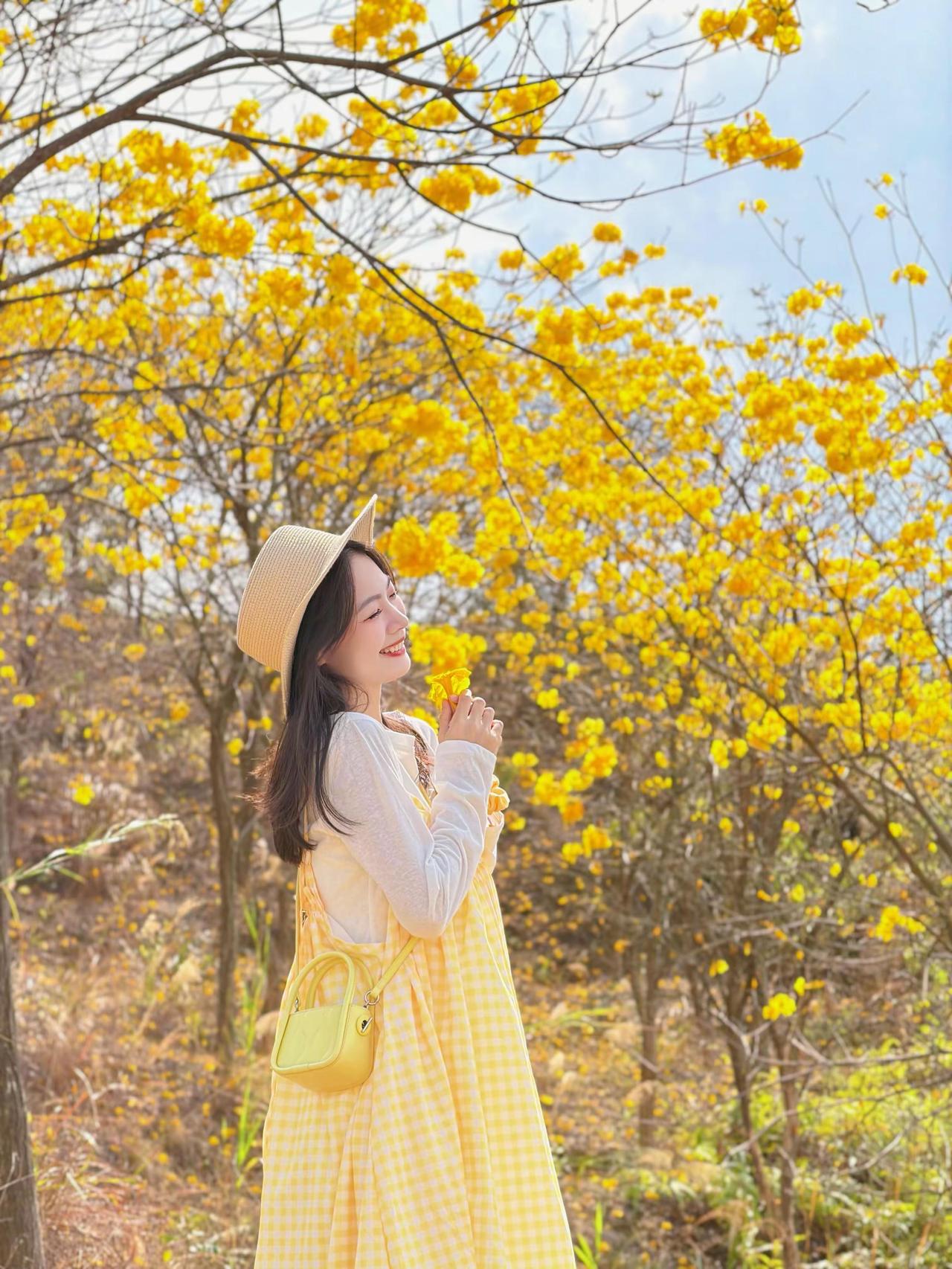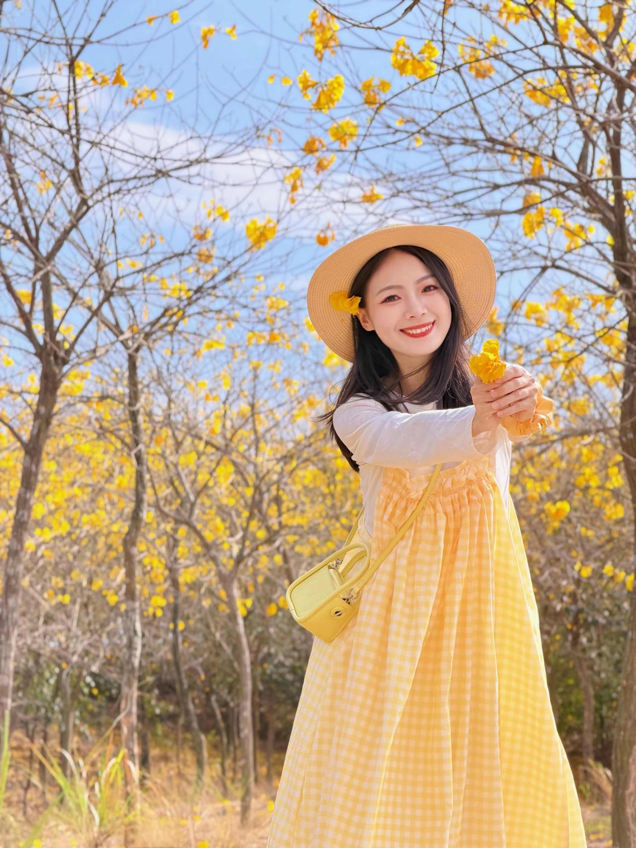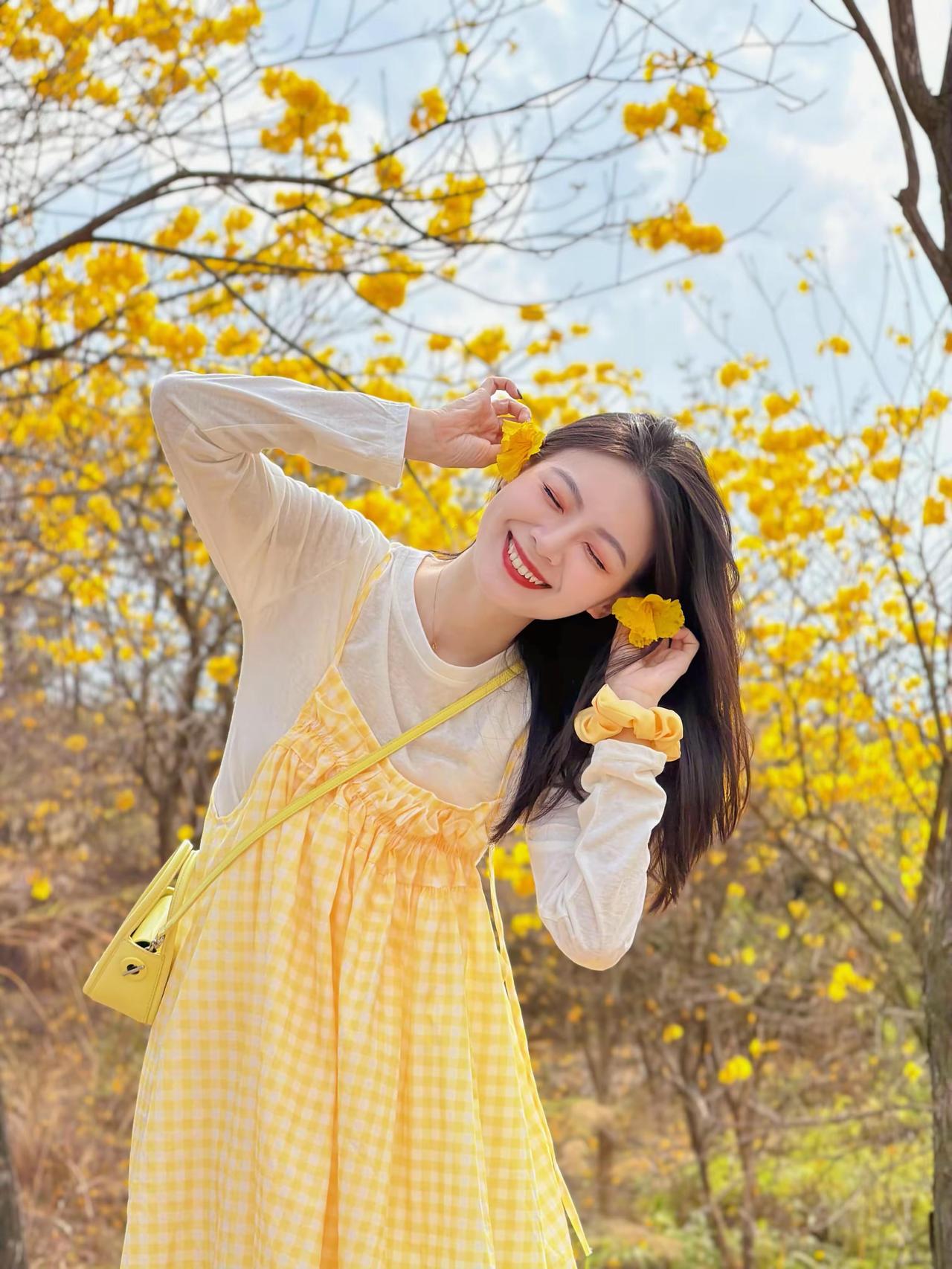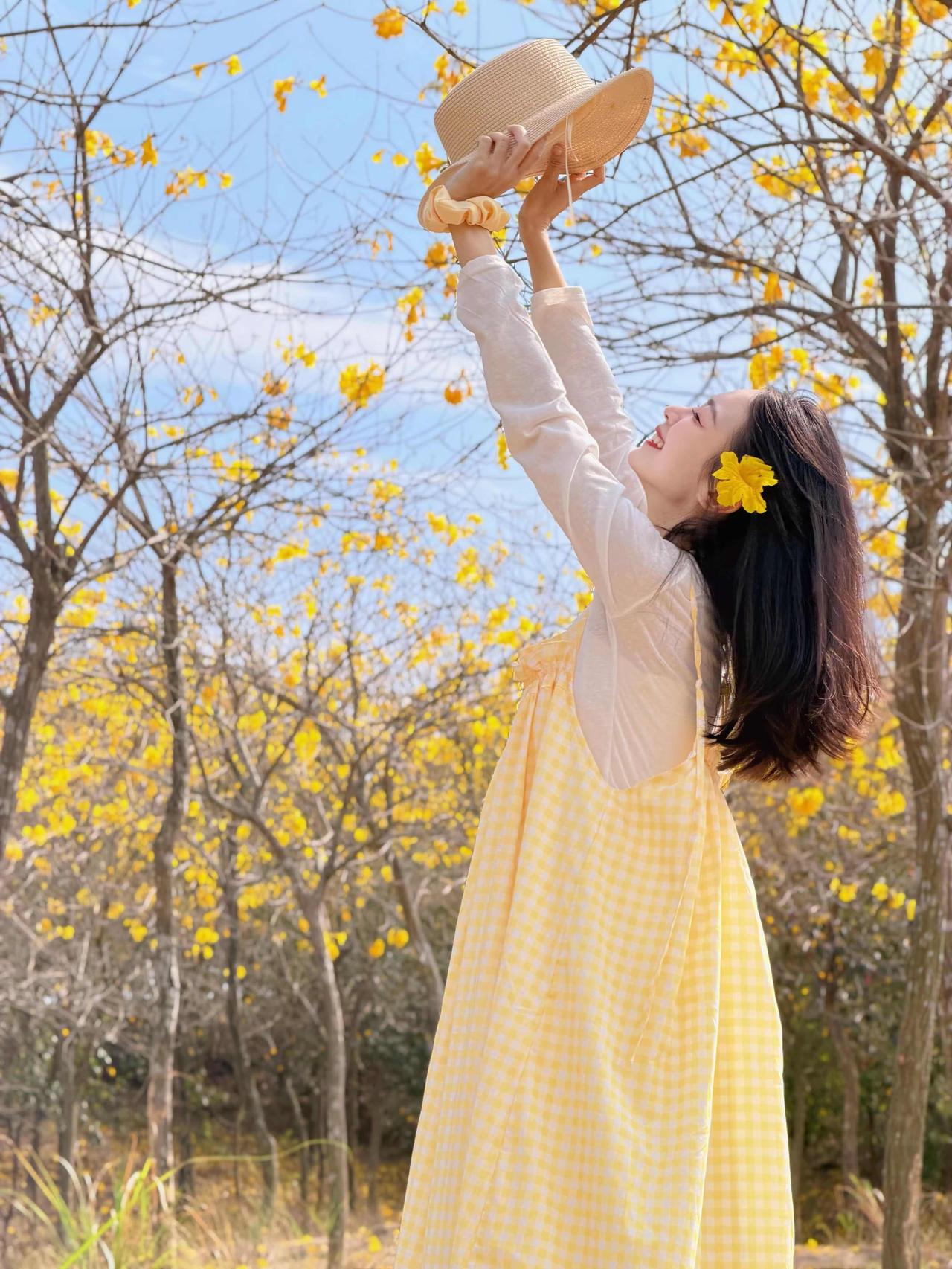 🌿 春日黄花风铃木森系穿搭 这套穿搭是黄花风铃木花海出游、森系野餐、户外踏青的满分穿搭,以黄白格纹为主角,完美融入春日金黄花海,氛围感与出片率双双拉满。 ✨ 核心单品解析 叠穿层次 • 内搭:米白色镂空花边长袖T恤 ◦ 软糯棉质亲肤透气,米白底色干净百搭,下摆镂空花边增添少女感,长袖设计应对户外微风,温柔又防晒。 • 外搭:黄白格纹吊带连衣裙 ◦ 春日专属的黄白格纹,与背景黄花风铃木形成色彩呼应,上镜自带元气滤镜;宽松吊带版型+抽褶细节,藏肉显瘦,营造松弛的森系少女感。 点睛配饰 • 草编渔夫帽:与森系场景完美融合,遮阳同时增添法式田园风,是户外拍照的氛围感神器。 • 亮黄色迷你斜挎包:小方包设计精致小巧,亮黄色提亮整体造型,与格纹裙、花海形成色彩呼应,吸睛不突兀。 • 黄色发圈/头花:细节感拉满,与花海场景融为一体,甜妹气质十足。 鞋履 • 黄色简约帆布鞋:与包包、格纹裙形成同色系闭环,舒适百搭,适合长时间户外行走,完美契合休闲出游场景。 🌟 风格亮点 1. 完美融入场景:黄白格纹与金黄花海、蓝天背景形成撞色,既不淹没在景色中,又和谐统一,是妥妥的“春日氛围穿搭”。 2. 松弛感少女风:宽松连衣裙+休闲内搭,无束缚感,搭配草编帽和帆布鞋,打造自然不做作的森系少女感。 3. 显白提气色:明亮的黄色系自带阳光感,完美衬托肤色,笑容更有感染力,拍照自带柔光滤镜。 💡 搭配延伸 • 更休闲:换白色帆布鞋+棒球帽,弱化裙装的柔美,打造元气休闲风。 • 更保暖:外搭米色针织开衫,应对春日早晚微凉,延续温柔气质。 • 更甜美:搭配黄色系发箍/发带,强化甜妹属性,适配野餐、闺蜜合照场景。 📸 场景适配 • 黄花风铃木花海:与成片金黄花树完美融合,是拍摄春日氛围感写真的首选穿搭。 • 户外野餐/踏青:舒适自在,适配草地、土路等多种户外地形,轻松出片。 • 闺蜜约会:清新甜美的风格与姐妹聚会场景高度契合,轻松成为朋友圈点赞收割机。 少女感 ootd