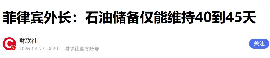 菲律宾彻底破防了,3月27日已经陷入能源荒的绝境,更令人震惊的是,它成了全世界第一个,因为能源短缺而紧急宣布进入紧急状态的国家,整个国家都在面临“油荒”的致命难题,举国上下人心惶惶! 其实早在3月24日,菲律宾总统马科斯就已经扛不住了,连夜签署了第110号行政令,正式宣布全国进入能源紧急状态,这个紧急状态一开始就定了一年的期限,除非总统提前解除或者延长,否则要持续一整年。 当时马科斯就明确表示,中东那边的冲突已经影响到了菲律宾的能源供应,对国家的能源安全构成了迫在眉睫的威胁,不得不采取紧急措施。 到了3月27日,局势变得更加严峻,当天菲律宾外长拉扎罗公开向外界表态,把国家的能源困境说得明明白白,没有一点隐瞒。 他直言,目前菲律宾的石油储备已经濒临告急,顶多只能维持40到45天,也就是说,再过一个多月,菲律宾可能就彻底没油可用了。这个消息一出来,原本就紧张的气氛变得更加恐慌,老百姓们都在担心,没油之后日子该怎么过。 可能有人会问,菲律宾怎么会缺油缺到这种地步?其实最根本的原因,就是它的石油几乎全靠进口,98%的石油都要从国外买,而且大部分都来自中东地区。 最近中东那边局势紧张,霍尔木兹海峡这个重要的石油运输通道通行受阻,中东的石油运不出来,国际油价就一路飙升,菲律宾作为高度依赖进口石油的国家,自然就首当其冲,一下子就陷入了油荒。 拉扎罗也直言不讳,能源价格一路飙升,已经给菲律宾的经济带来了连锁反应,各行各业的从业者,没有一个能独善其身,全都被这场能源危机拖累着。从老百姓的日常生活,到企业的生产经营,再到国家的公共服务,全都受到了严重影响。 现在菲律宾的汽柴油价格,自从2月底以来已经上涨了一倍多,首都马尼拉的加油站,有的电子价牌都因为数字太长,显示不下油价。 油价一涨,出行成本就跟着涨,很多开吉普尼的司机,根本赚不到钱,只能聚集在街头抗议,3月26日就有不少司机罢工,抗议油价上涨和政府不作为。 普通家庭也深受影响,电费跟着上涨,哪怕用电量和以前一样,每个月的电费也多了不少,为了省电,很多家庭都尽量减少外出,在家也错开电器使用时间,不敢同时开高耗能的电器。 再看各行各业,交通行业受影响最大,很多航空公司都被告知无法在菲律宾加油,航班只能自带燃料往返,长途航班的问题更严重。 物流行业也一样,油价上涨让运输成本大幅增加,不少物流公司只能提高运费,这就导致食品、日用品等物资的价格也跟着上涨,进一步加重了老百姓的生活负担。 中小企业的日子也不好过,电力、物流、原材料的成本都在上涨,很多小老板只能提前采购物资,推迟企业扩张计划,有的甚至只能减少开工时间,勉强维持经营,生怕一不小心就倒闭。 就连政府机构也受到了影响,首都的多个政府机构已经实行每周四天办公,部分学校也调整了课程安排,都是为了节约能源。 面对这样的困境,菲律宾政府也采取了一些措施,能源部长透露,政府正在从东南亚及其他地区采购约100万桶石油作为缓冲库存,还计划暂时增加燃煤发电量,来满足全国的用电需求。 同时,政府还授权可以直接采购燃料和石油相关产品,必要时还能预付部分合约款,甚至给公共交通从业人员发放补贴,部分城市也开通了免费公交,尽量减轻老百姓的负担。 除此之外,菲律宾还打破了五年的禁令,重新从俄罗斯进口石油,3月24日就有一艘装载着10万吨俄罗斯石油的油轮抵达菲律宾,这也是五年来说第一批俄油进入菲律宾。 不过这也只是权宜之计,因为这次能进口俄油,是因为美国给了一个临时豁免期,一旦豁免期结束,菲律宾又会面临进口石油的难题。 尽管政府做了不少努力,但菲律宾的能源危机依然没有得到根本缓解。目前的石油储备只能维持40到45天,下一批采购的石油能不能按时到位,还是个未知数。而且菲律宾国内只有一家炼油厂,就算有了进口石油,加工能力也有限,根本跟不上国内的需求。 这场能源危机,也彻底暴露了菲律宾能源结构的短板,过度依赖进口石油,自身没有稳定的能源供应,一旦国际能源市场出现波动,或者运输通道受阻,整个国家就会陷入被动。 现在的菲律宾,举国上下都在为能源问题发愁,老百姓担心没油、没电,企业担心经营不下去,政府也在想尽一切办法应对,但想要彻底走出这场绝境,恐怕还有很长的路要走。 其实菲律宾的困境也给其他国家提了个醒,能源安全至关重要,过度依赖进口,就相当于把自己的能源命脉交到了别人手里,一旦出现意外,就会陷入难以挽回的境地。 而菲律宾现在的遭遇,就是最真实的例子,这场油荒不仅拖累了经济,也让老百姓的生活陷入了困境,想要摆脱这种局面,不仅需要短期的应急措施,更需要长期调整能源结构,找到属于自己的能源安全之路。