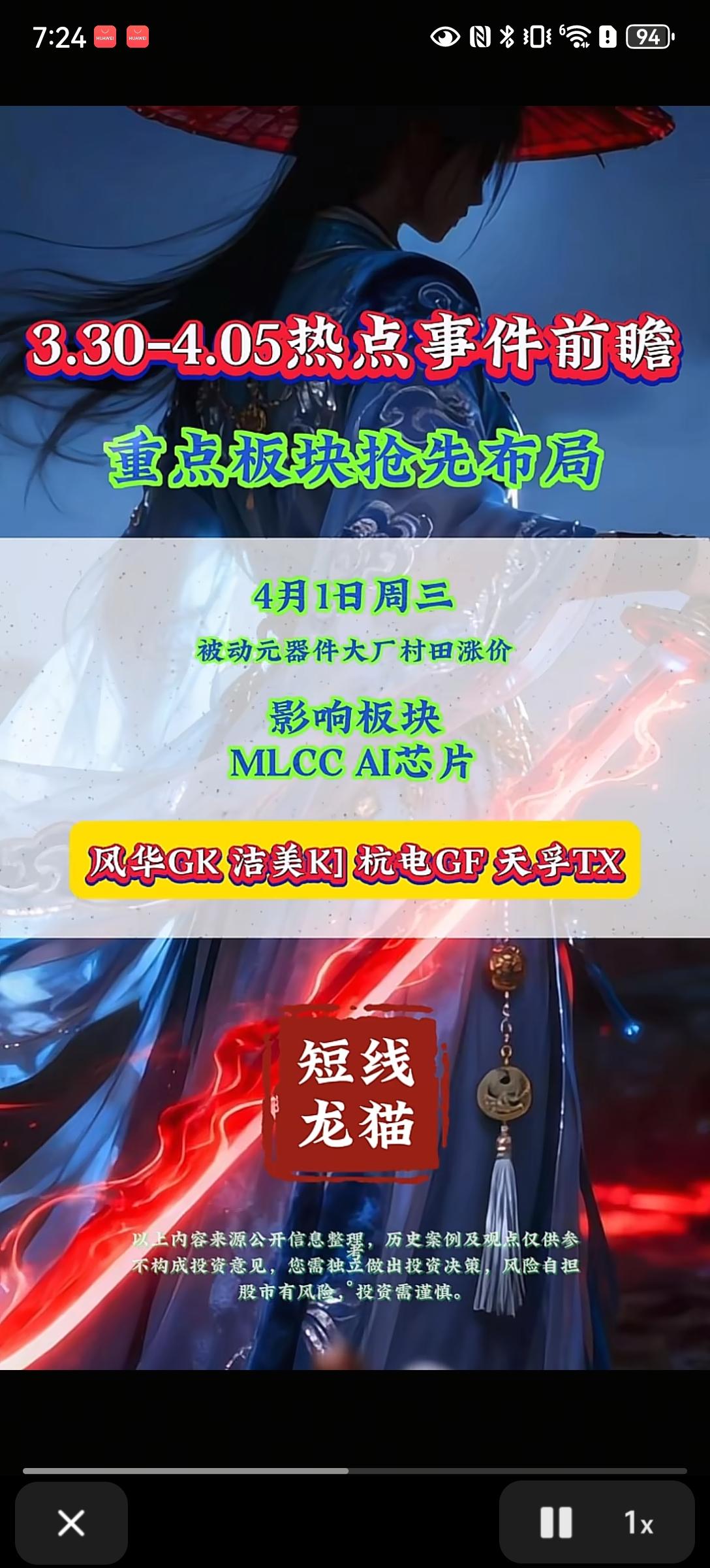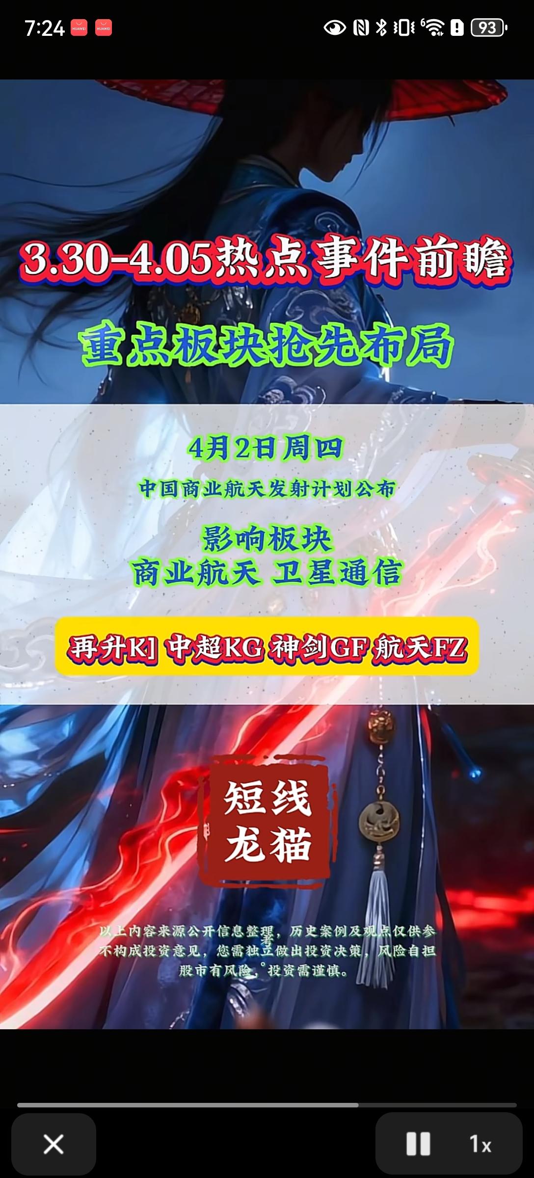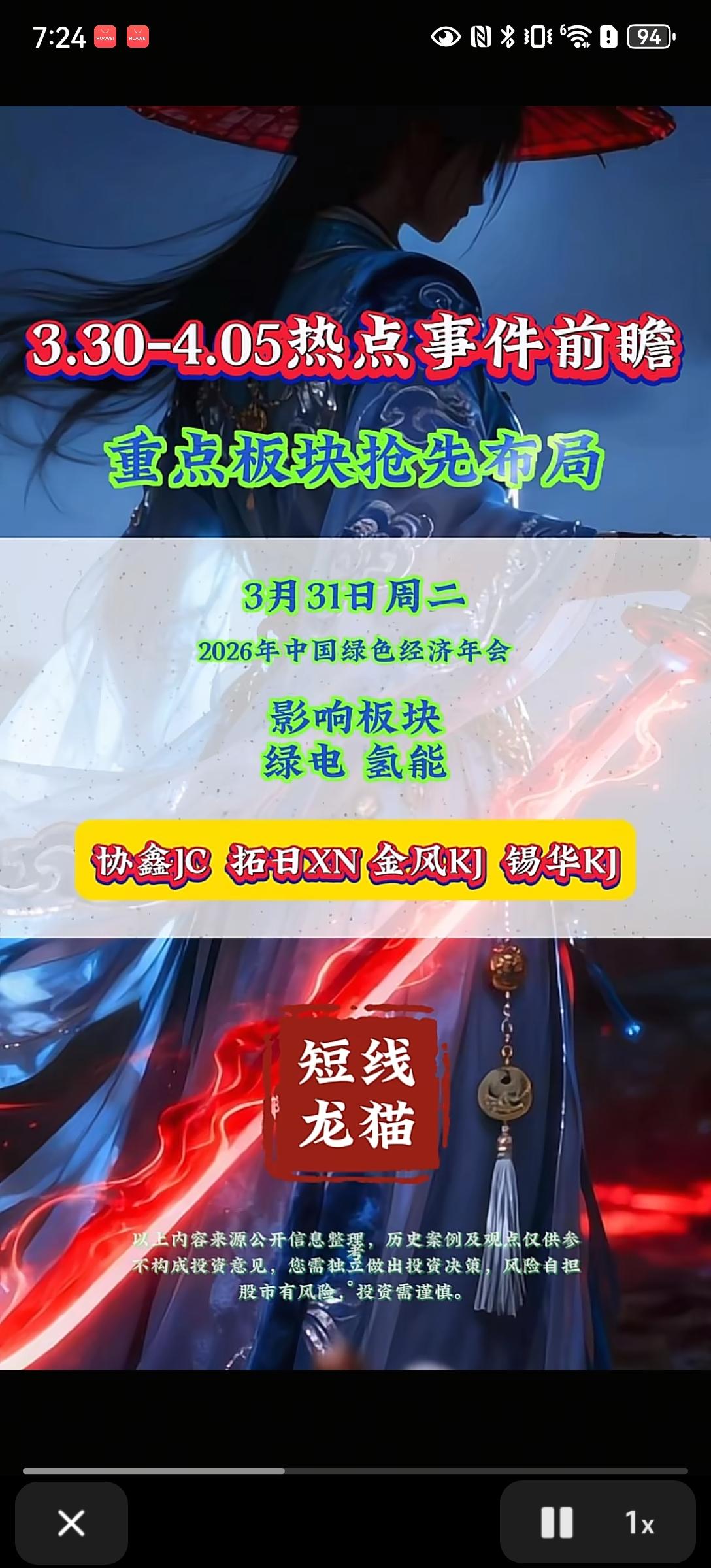3.30-4.05市场事件前瞻解析 3月30日至4月5日,多场行业会议与产业事件密集落地,将成为驱动板块轮动的核心催化,市场主线或围绕能源科技、数字基建、商业航天三大方向展开。 能源电力赛道迎来政策催化窗口:3月30日中国电力行业大会聚焦电网建设与绿电发展,叠加3月31日中国绿色经济年会对氢能、新能源的产业引导,电力、绿电板块有望迎来主题性行情,节能风电、新能泰山等标的值得关注。 数字科技领域催化密集:4月1日,被动元器件大厂村田涨价将直接带动MLCC、AI芯片板块景气度修复,风华高科等国产替代标的受益;同日算力互联互通行动计划推进,算力、算电协同板块将获政策加持,奥瑞德等相关企业或迎来资金关注。 商业航天赛道迎来多重事件驱动:4月2日中国商业航天发射计划公布,叠加4月3日太空算力产业大会、天兵科技火箭首飞两大事件,卫星通信与商业航天产业链将迎来情绪与基本面双重催化,神剑股份、航天发展等标的有望成为资金焦点。 整体来看,本周市场事件驱动特征显著,多主线轮动节奏加快,投资者需结合事件时间节点,聚焦政策与产业催化明确的细分赛道,同时警惕事件落地后的资金兑现风险。