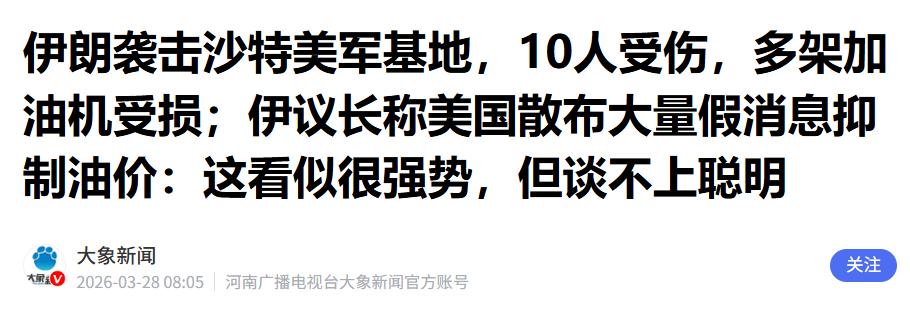 美军损失惨重!开战29日首次出现 今天是3月28日,中东地区的战争已经进入第29天,突然美国媒体报道了一条坏消息:美军驻沙特军事基地遭遇重大伤亡,损失惨重。 这次被袭击的是沙特的苏丹王子空军基地,这个基地里驻扎着不少美军,还有大量美军的战机和支援装备,是美军在中东地区的重要据点,平时防守也十分严密,按说不该被轻易袭击。 但伊朗这波下手是真的够狠,根本没给美军留任何反应时间,直接动用了导弹加无人机的组合拳,对着这个基地就展开了精准打击。 根据美国和沙特知情官员披露,这次袭击至少有一枚导弹和数架无人机击中了基地,基地内的一栋建筑被直接命中,当时有不少美军正在这栋建筑里,结果当场就有至少10名美军挂了彩,其中有2人伤势特别严重,被紧急送进了重症监护室,能不能顺利脱离危险还不好说。 除了人员伤亡,美军的装备损失更是让五角大楼心疼到不行。大家可能不知道,美军在这个基地部署了好几架KC-135空中加油机,这种加油机是美军战机的“后勤奶妈”,主要负责在天上给战斗机加油,没有它,美军的战机根本飞不远、滞空时间也会大幅缩短,在中东地区的空中优势就会大打折扣。 可就是这种关键装备,被伊朗的导弹直接炸瘫在了地上,从伊朗公布的卫星图像能清楚看到,至少有3架KC-135被彻底炸毁,还有3到4架受损严重,基本丧失了作战能力,短时间内根本修不好。 说出来大家可能不信,这一架KC-135空中加油机,造价就高达几千万美元,好几架被炸毁、炸瘫,光装备损失就已经是一笔天文数字了。 更让美军头疼的是,这已经不是苏丹王子空军基地第一次被袭击了,开战以来,这个基地就多次遭到伊朗的导弹和无人机打击,成了伊朗重点“照顾”的目标,可美军却始终没能有效防范,每次都只能被动挨打。 其实早在3月14日,就有消息说这个基地的美军加油机遇袭受损,当时美国总统还特意发文,说没有加油机被摧毁,只有一架受损,试图淡化损失,稳住士气。 可这次伊朗的打击太猛烈,卫星照片都公之于众了,美军再想隐瞒也瞒不住了,只能被迫承认损失惨重。 说实话,这仗打到这份上,美军的脸面早就挂不住了。一开始美军仗着自己装备先进,联合以色列对伊朗狂轰滥炸,还宣称要推翻伊朗政权,可打了29天,不仅没能实现目标,反而被伊朗反击得节节败退。 据统计,开战以来,美军已经有至少13人死亡,303人受伤,其中10人伤势严重,军备损失接近30亿美元,这样的损失,对于号称“世界第一军事强国”的美国来说,无疑是一次沉重的打击。 更尴尬的是,面对伊朗的反击,美军似乎没什么好办法。伊朗拥有中东地区规模最大的弹道导弹库存,还有大量的自杀式无人机,射程能覆盖整个中东地区,美军虽然在沙特部署了“爱国者”等防空反导系统,可这次还是没能拦住伊朗的导弹和无人机,足以说明美军的防空系统也不是万能的。 还有沙特的态度,也让美军十分难堪。袭击发生后,沙特方面发文说,他们成功拦截了2枚导弹,剩余的导弹都落入了波斯湾和无人区,还说因为没有伤及沙特平民,所以这次袭击“不算本土受损”。 明眼人都能看出来,沙特这是在和稀泥,不想因为美军的事得罪伊朗,毕竟沙特和伊朗相邻,不想被卷入这场战争的漩涡,可这样一来,就相当于把美军晾在了一边,让美军更加孤立无援。 伊朗方面也明确表示,这次袭击是对美以联合袭击伊朗的报复,只要美以不停止对伊朗的军事行动,伊朗就会继续反击,而且不会有任何红线,美国和以色列在中东地区的所有设施和利益,都是伊朗的合法打击目标。 不仅如此,伊朗还把以色列境内的6家钢铁厂,以及地区内5个国家的相关工业设施,列为了新的报复目标,态度十分强硬。 现在的美军,可以说是进退两难。继续打下去,只会付出更大的损失,而且很难占到便宜;可如果就此撤军,又太没脸面,毕竟一开始把话说得太满,一旦撤军,就意味着美军在中东的影响力会大幅下降,之前的投入也都打了水漂。 这件事也能看出来,美军并不是不可战胜的,所谓的“军事优势”,在伊朗的坚决反击面前,也显得不堪一击。 开战29天,美军首次遭遇这样的重创,不仅损失了大量的人员和装备,更丢尽了脸面,也让全世界看到,美国想靠武力称霸中东、随意欺负其他国家,已经越来越难了。 以后再想在中东横行霸道,美军恐怕得好好掂量掂量,自己有没有那个实力,能不能承受住伊朗的反击。