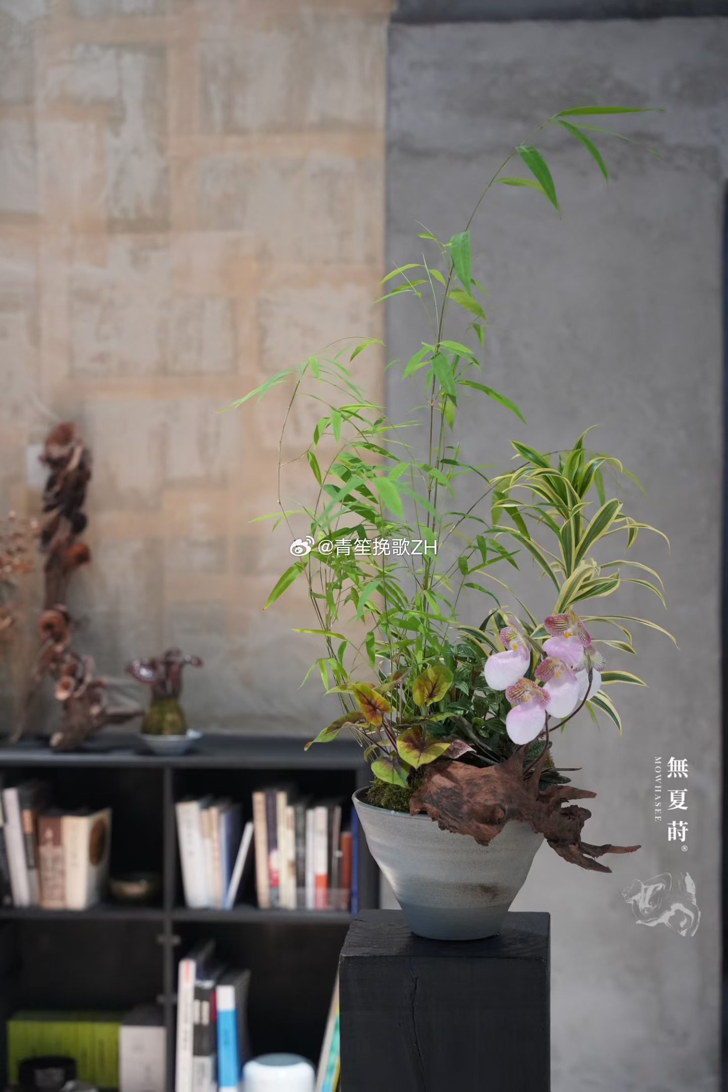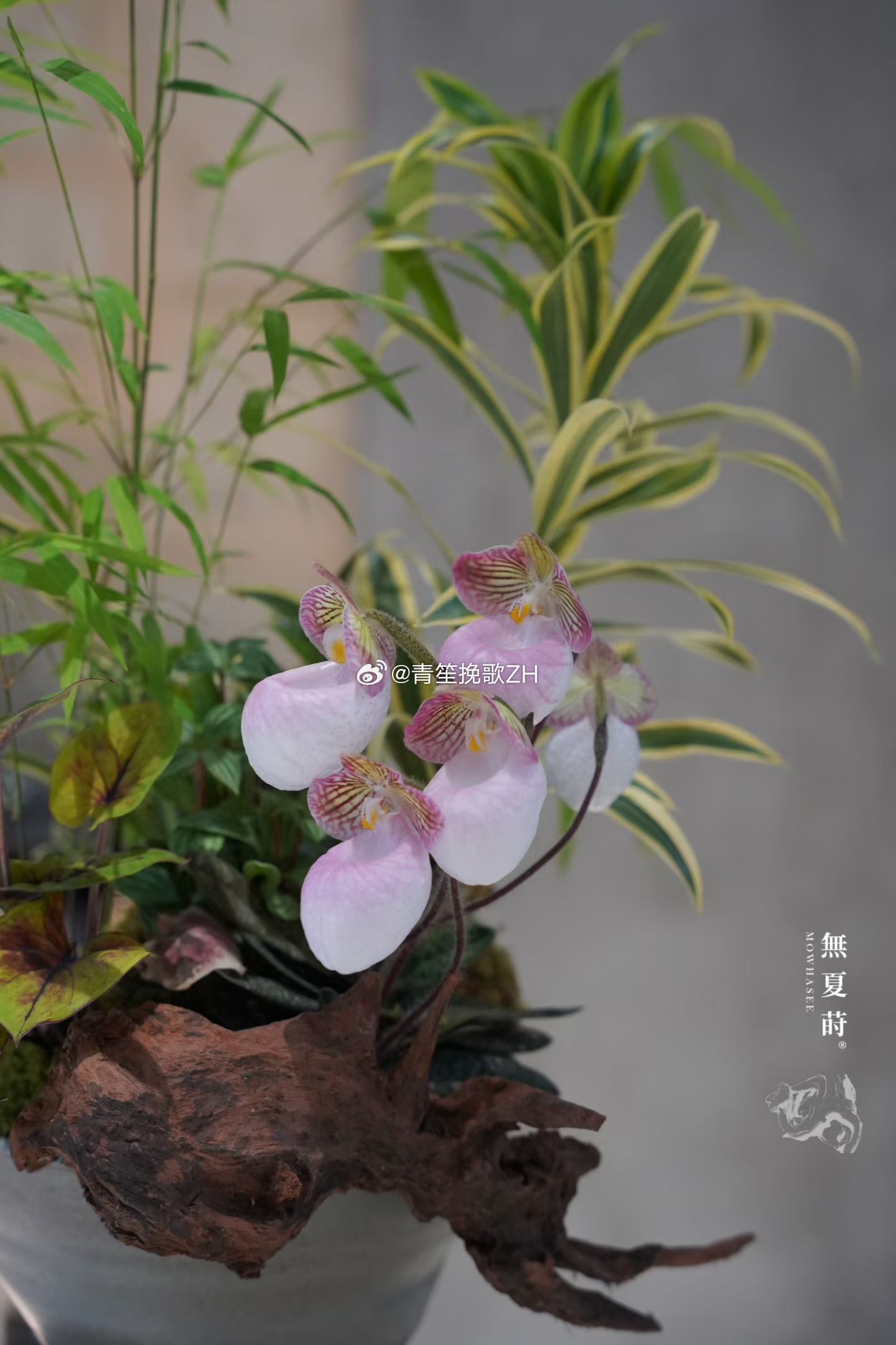 随手拍把春天种在桌面上🍃于無夏之镜莳养观息门竹立骨,兜兰点韵,金边百合竹添一抹清辉,根雕承古意,竹芋展翠微——诸物相谐,案头自成丘壑。