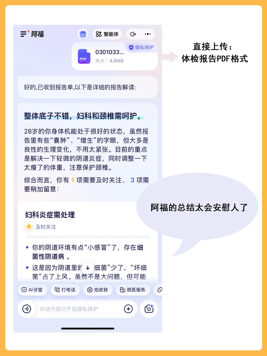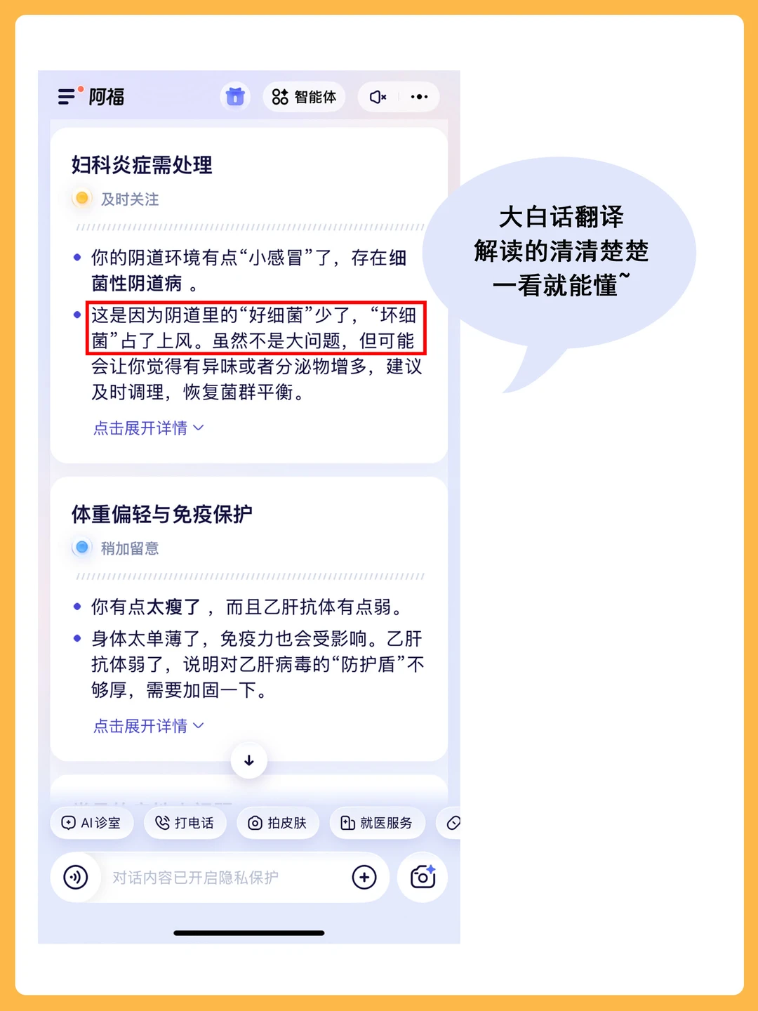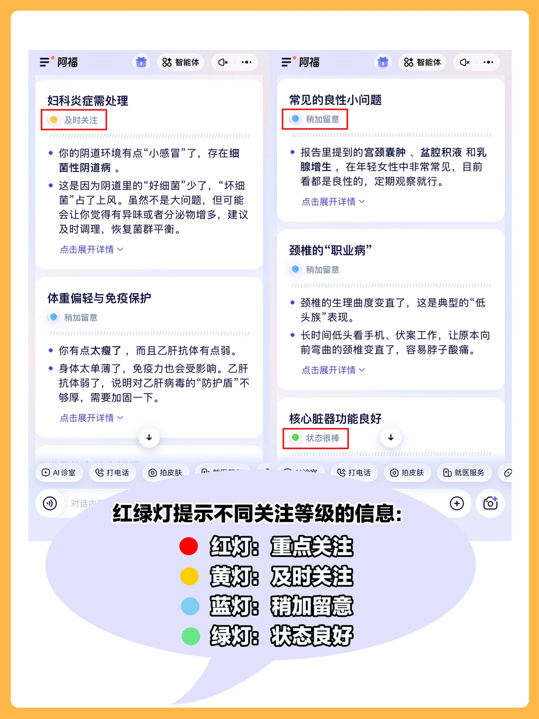 有些小问题它会告诉我“暂时不用管,该吃吃该喝喝”;但如果是需要重视的,它会直接给我标一个醒目的红灯🔴告诉我这是需要重点关注的问题,像这个阴道炎我也以为很严重,实际上只是黄灯🟠是坏细菌占了上风,每天按时塞点药恢复🦠平衡,定期复查监测就好了。