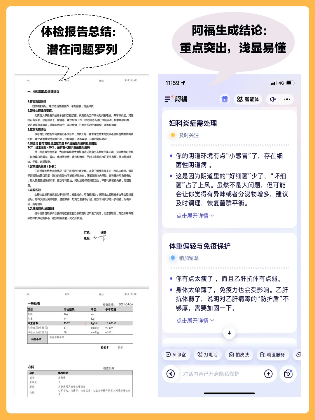 我体检报告里有一些囊肿,增生——我第一反应是“完了,是不是长坏东西了”。结果阿福告诉我:其实这些就是身体的一些良性的生理变化,建议结合彩超再看。一下子就没那么慌了。