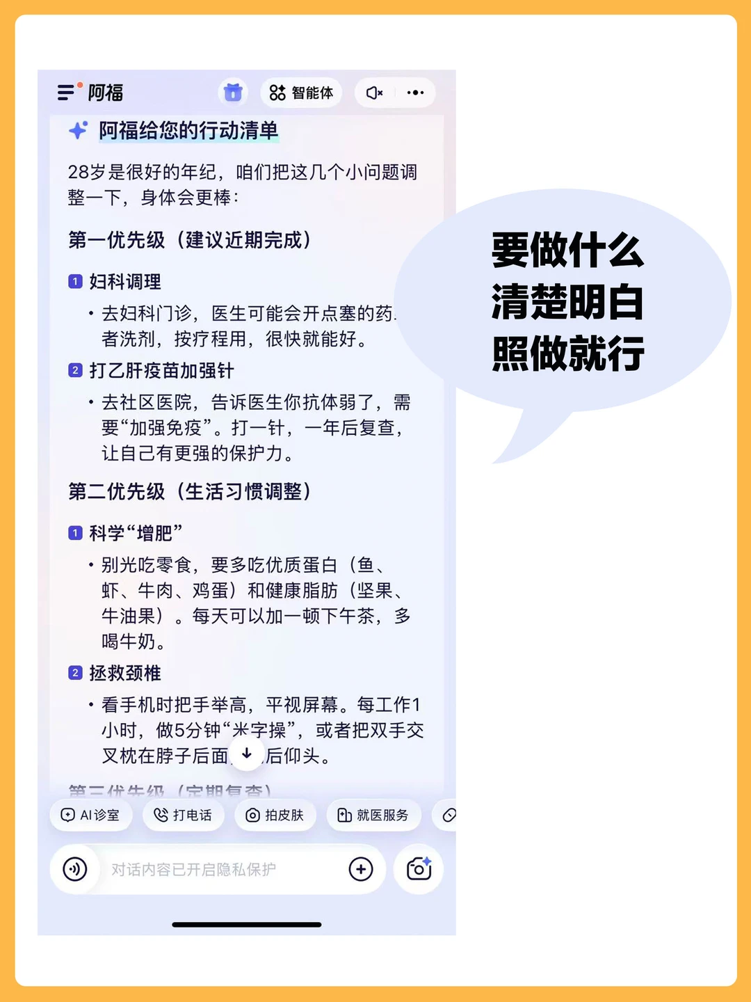 [向右R]不仅告诉我们有什么问题,还顺带把行动清单都给我列好了,建议去妇科科室、去打乙肝疫苗加强针等等一目了然,直接跟着阿福做就行了[赞R]