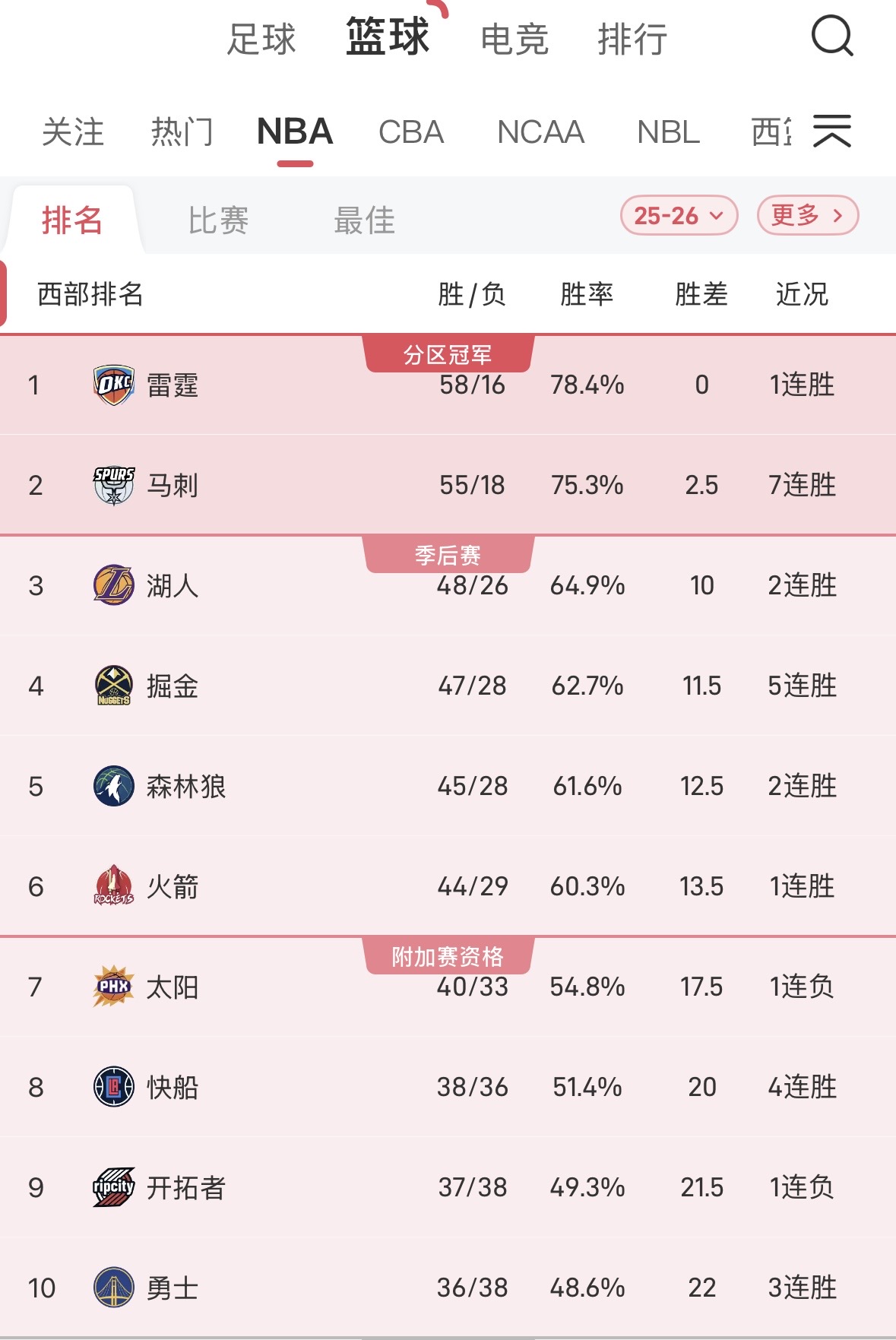 1. 湖人:48-26(第3,+1.5,剩8场)