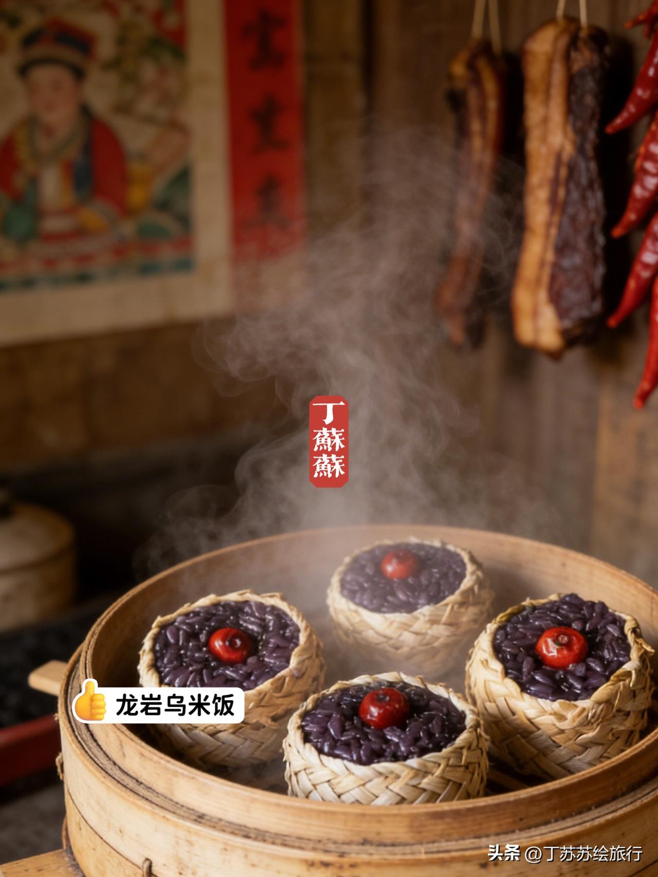也是农历三月三上巳节的闽越食物,用南烛木(乌饭树,现在真的就叫乌饭树)的叶子把米饭染成绀青之色,到了明代之后,工序简化成为凊饭。