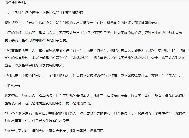 有网友以“理性讨论张雪峰的定位和事迹”为题,对张雪峰进行了盖棺论定! 但也有网友提出不同意见,认为:张雪峰远不是圣人,以放大镜去看大可不必。再加上直播工作的性质,很多话可能是没经过深思熟虑脱口而出的,当然这也可能是更能体现个人潜意识的想法,他就是这么认为的。 在这辩论“信息”“知识”有什么区别没多大意义,看事实。事实就是不管“信息”也好,“知识”也好,很多缺乏“信息”和“知识”的家庭和学子通过张雪峰,获得了相当宝贵的指引。 君子论迹不论心,从这点讲,不管他有无私心有无牟利,我仍然认为张雪峰的事业用伟大形容不算太夸张! 你怎么看?