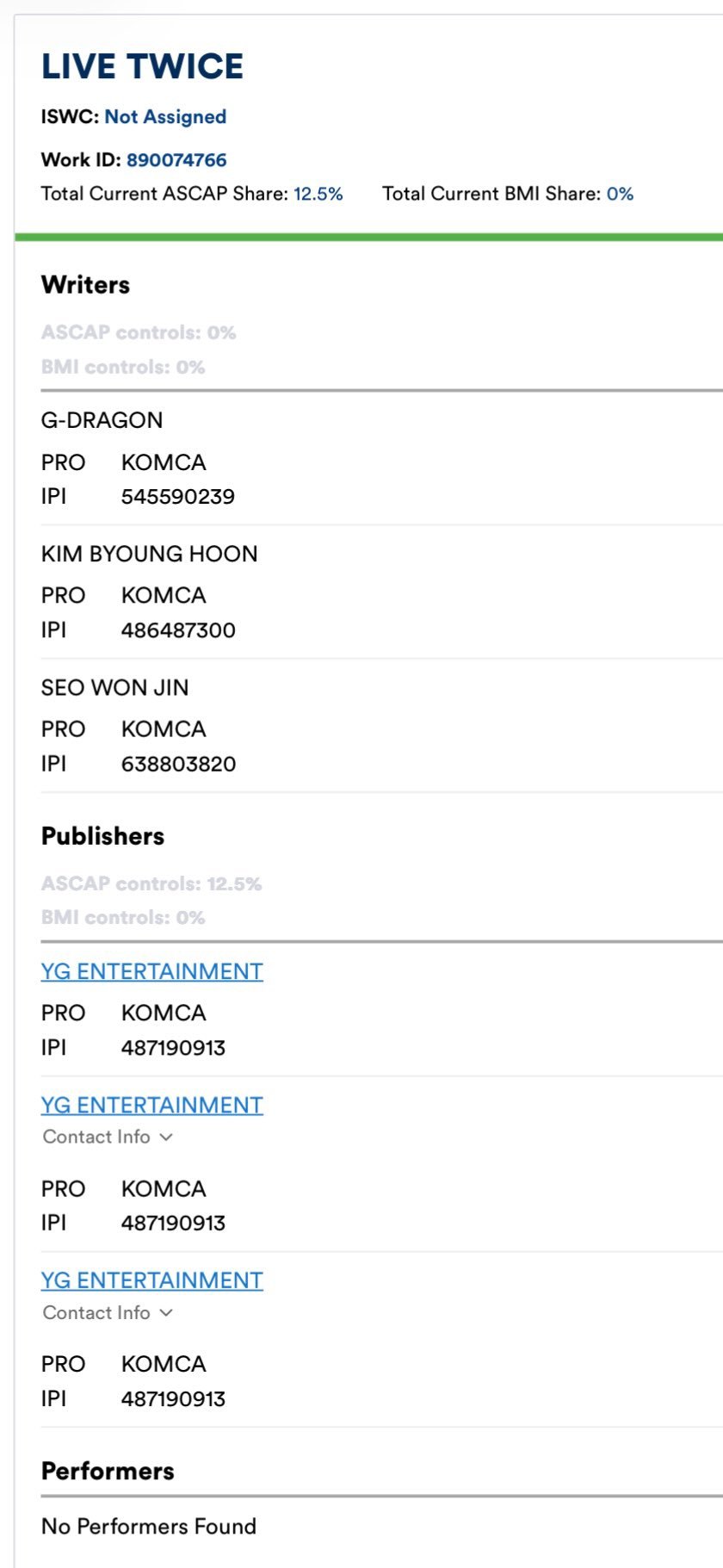 BIGBANG或将发行新歌BIGBANG或将回归BIGBANG或将在科切拉前发行新歌粉丝发现美国音乐版权协会上出现了GD作曲的《Live Twice》的歌曲信息,Performer还未登录,因为GD《Power》发行前也曾被这样剧透过所以大概率是真的…