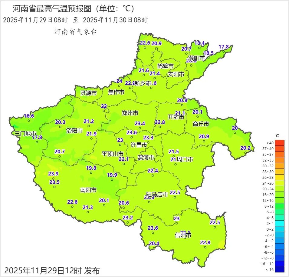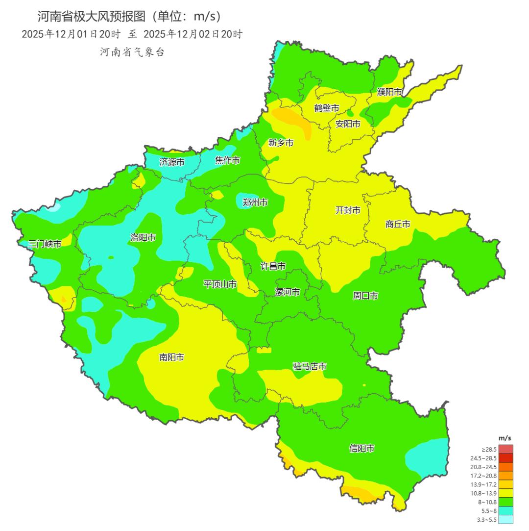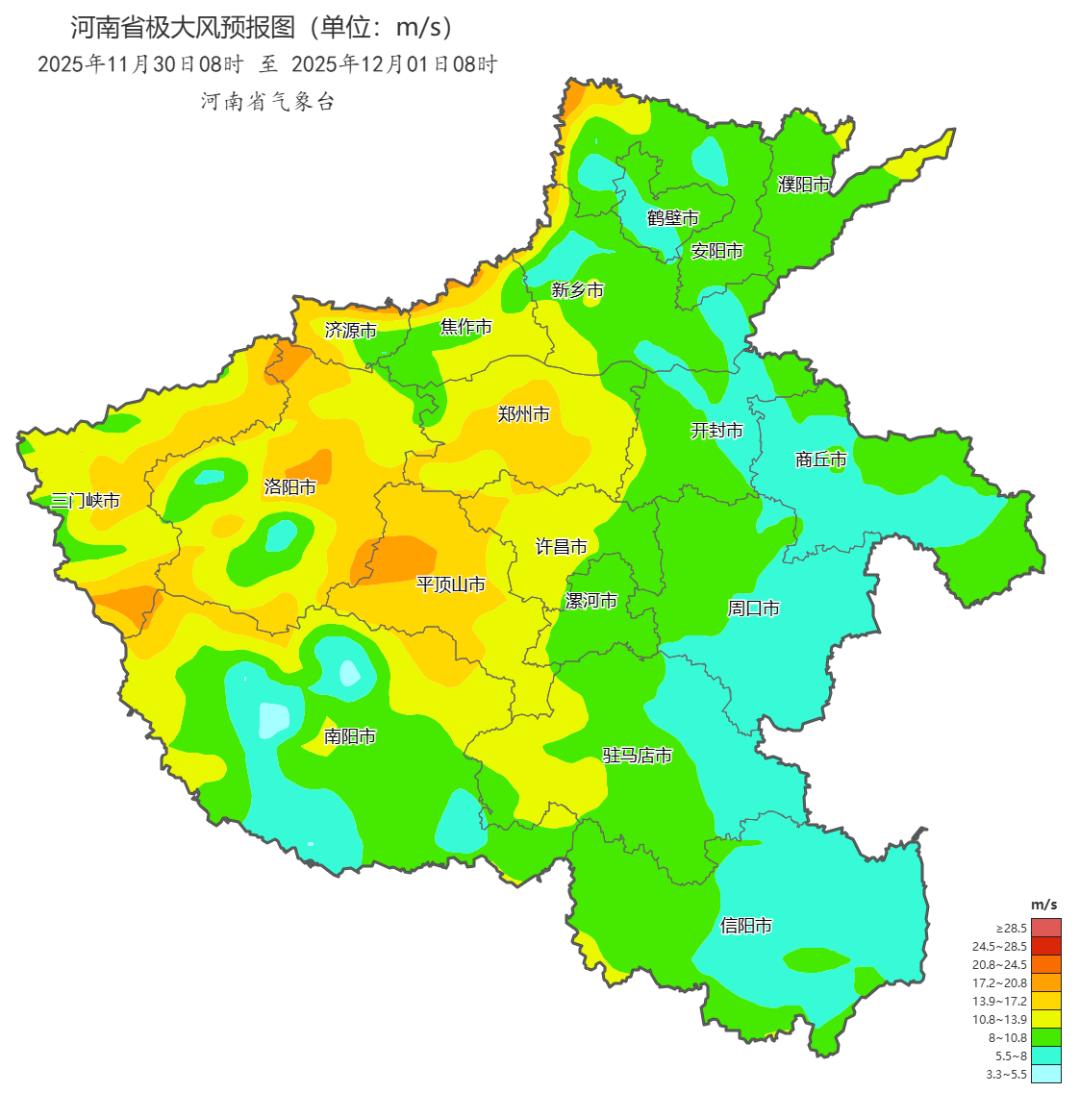 11月28日8时至29日7时,黄河以南和西北部出现6级以上极大风,局地9级。