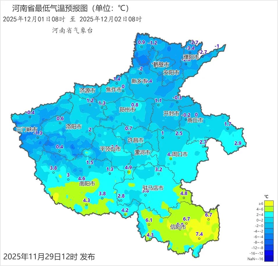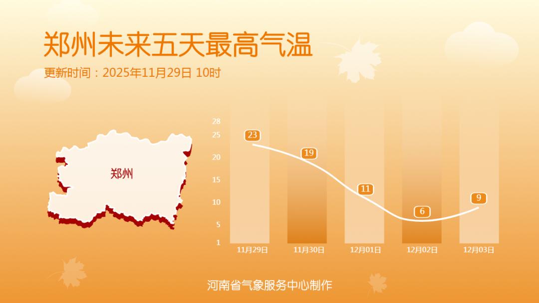 不过,升温即将被冷空气“打断”。随着两轮冷空气的接连影响,预计11月30日至12月3日全省气温持续下降,多地最高气温将由今天的20°C+一路跌至5°C附近,可谓是“满20°C减15°C”!如郑州下周二(12月2日)最高气温仅6℃,相比今天累计降幅达17℃!