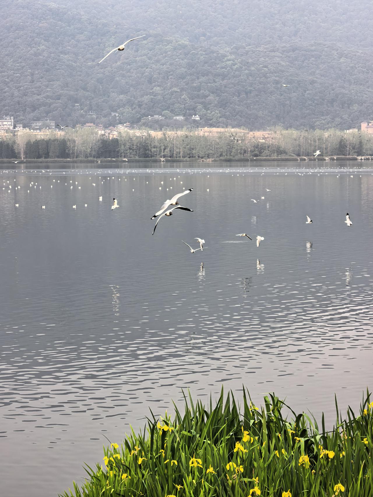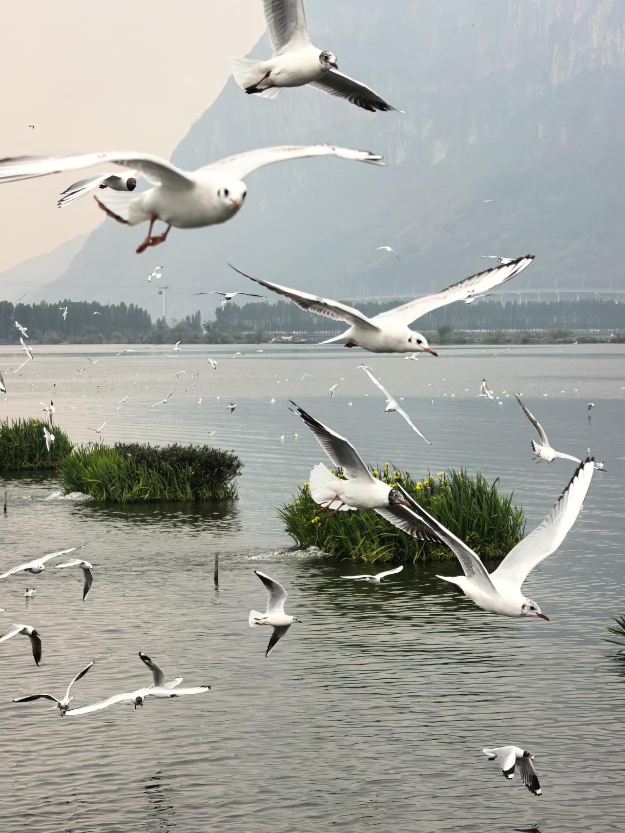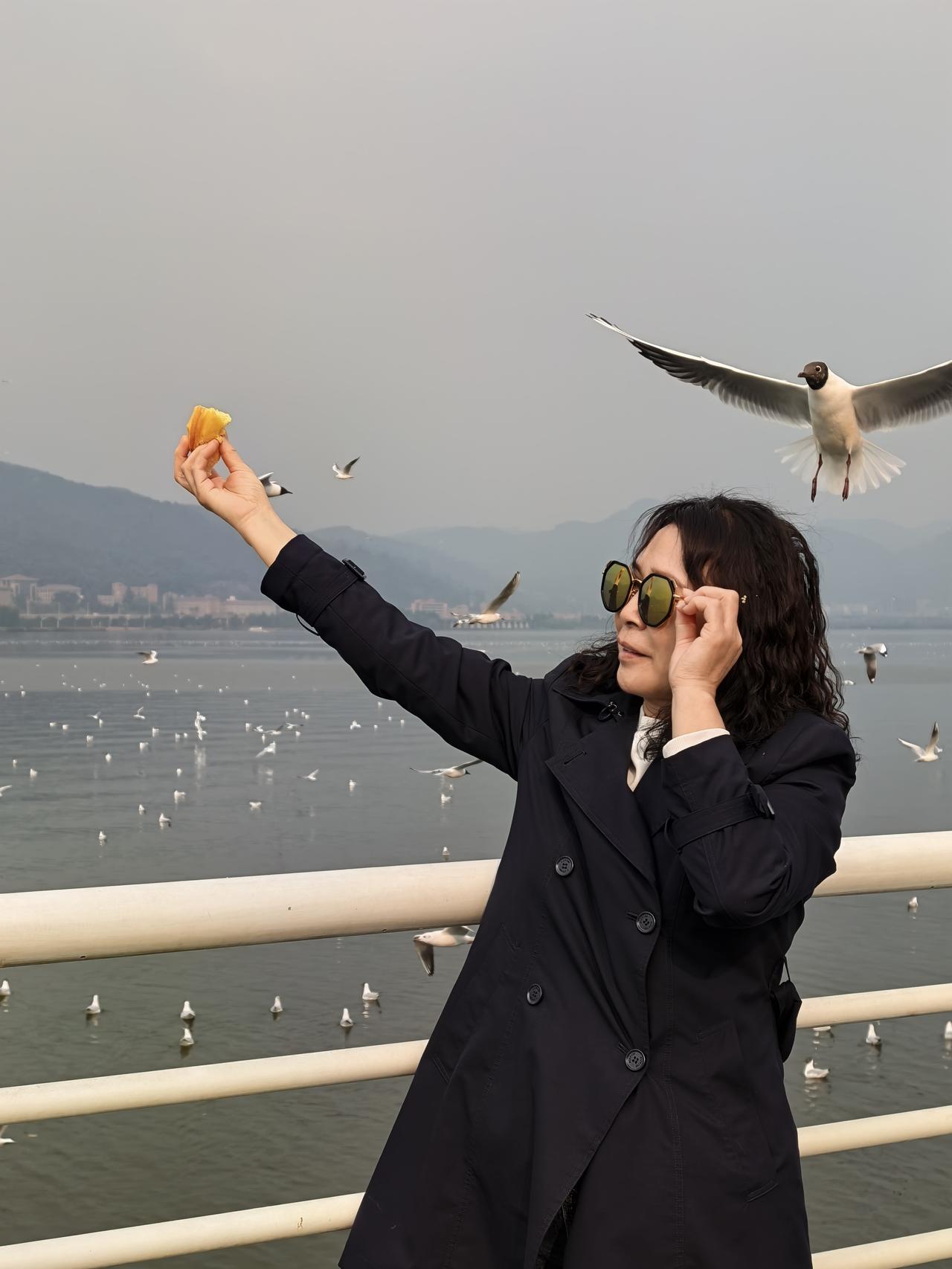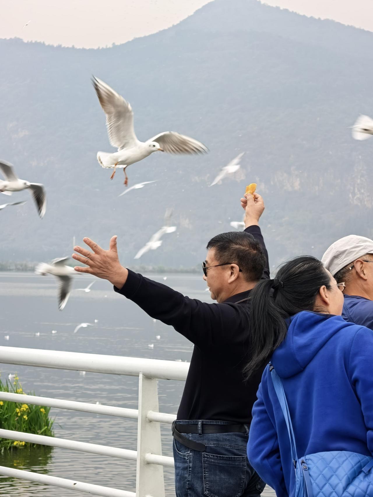 滇池边的“无人机”——红嘴鸥 滇池畔,红嘴鸥化身灵动的“空中无人机”,振翅穿梭。它们衔着西伯利亚的风,赴一场跨越山海的约定。春天,还没有迁徙的红嘴鸥,虽然数量没有冬天那么多,它们留在滇池,继续给人们带来欢乐。你看,这些小精灵俯冲时如精准的巡航轨迹,悬停似悬停待命的机身,每一次振翅,都在滇池的碧波上绘出流动的诗行。 面包屑抛起的瞬间,白羽划出优美弧线,仿佛解锁了自然的互动程序。它们停驻肩头,翅膀轻擦发梢,把治愈揉进每一次近距离的相遇。四十年奔赴,这群白色精灵用翅尖,在滇池边写下最长情书,让春城的春天,满是会飞的浪漫。