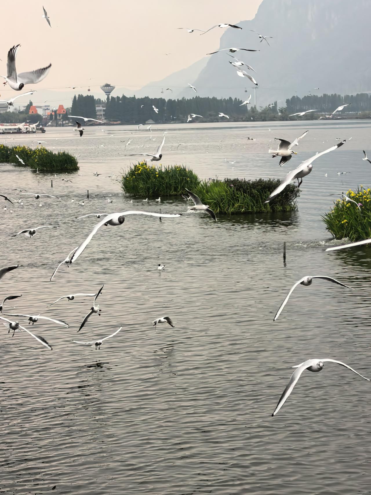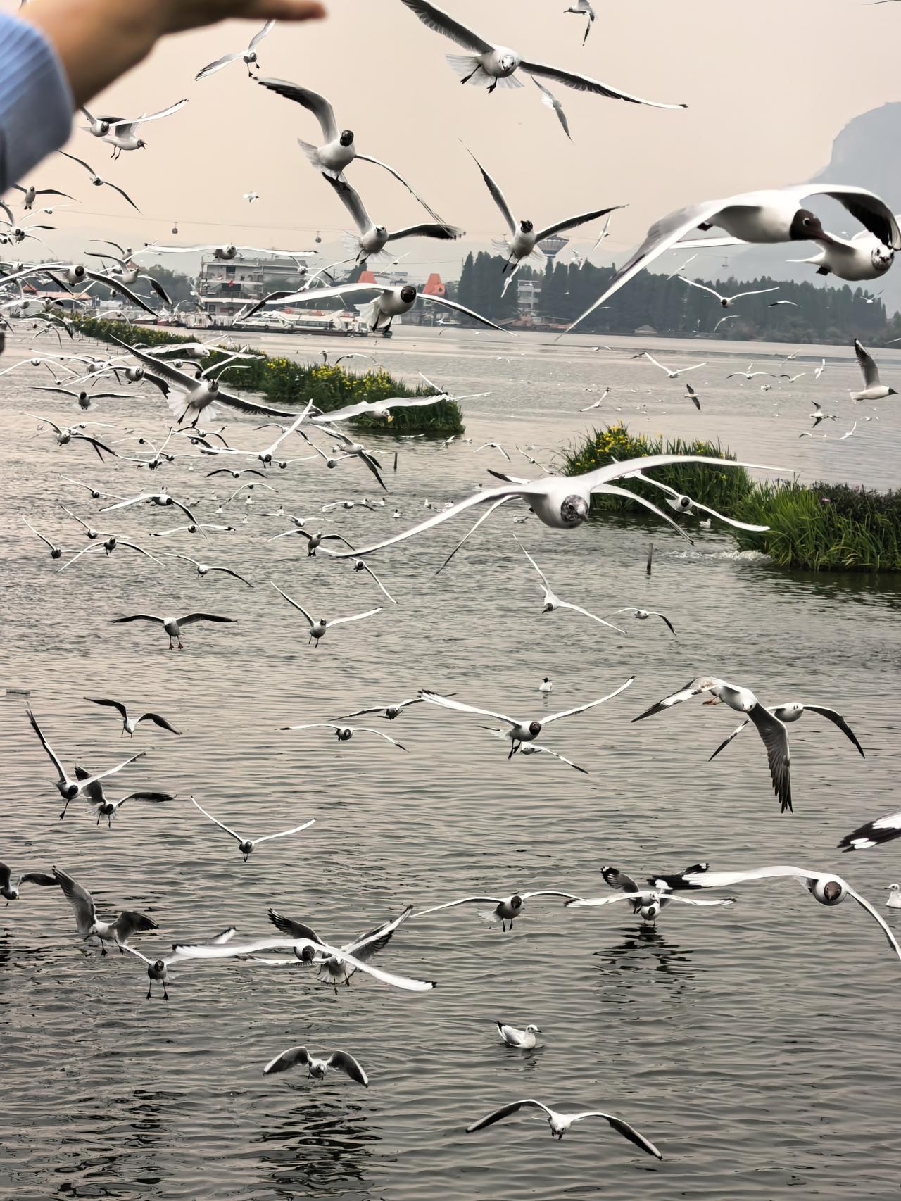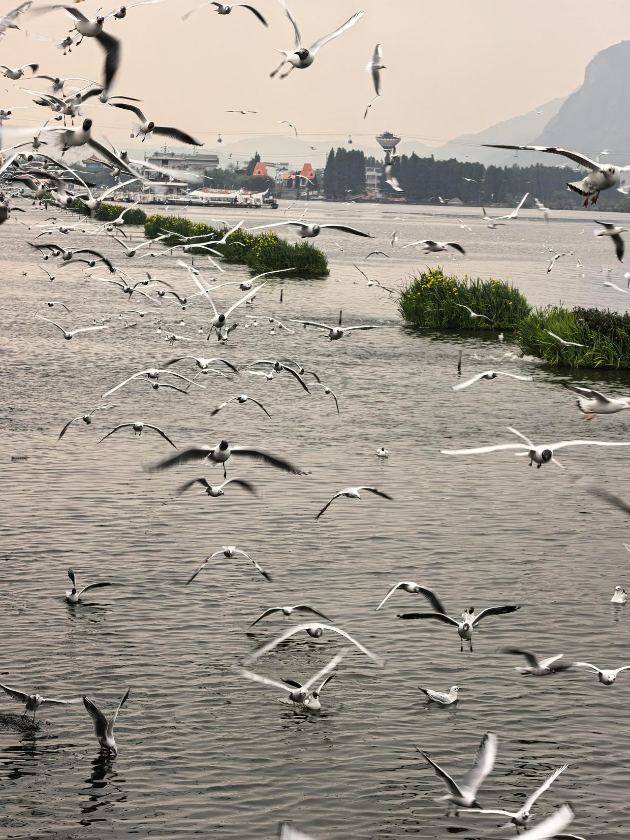 滇池边的“无人机”——红嘴鸥 滇池畔,红嘴鸥化身灵动的“空中无人机”,振翅穿梭。它们衔着西伯利亚的风,赴一场跨越山海的约定。春天,还没有迁徙的红嘴鸥,虽然数量没有冬天那么多,它们留在滇池,继续给人们带来欢乐。你看,这些小精灵俯冲时如精准的巡航轨迹,悬停似悬停待命的机身,每一次振翅,都在滇池的碧波上绘出流动的诗行。 面包屑抛起的瞬间,白羽划出优美弧线,仿佛解锁了自然的互动程序。它们停驻肩头,翅膀轻擦发梢,把治愈揉进每一次近距离的相遇。四十年奔赴,这群白色精灵用翅尖,在滇池边写下最长情书,让春城的春天,满是会飞的浪漫。