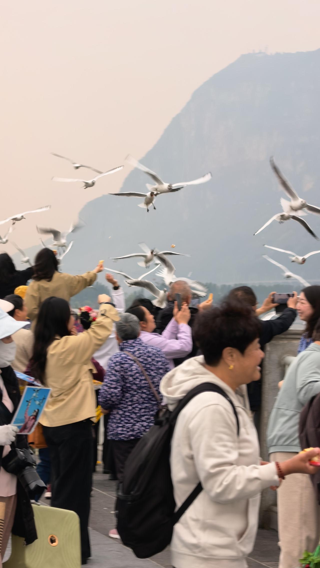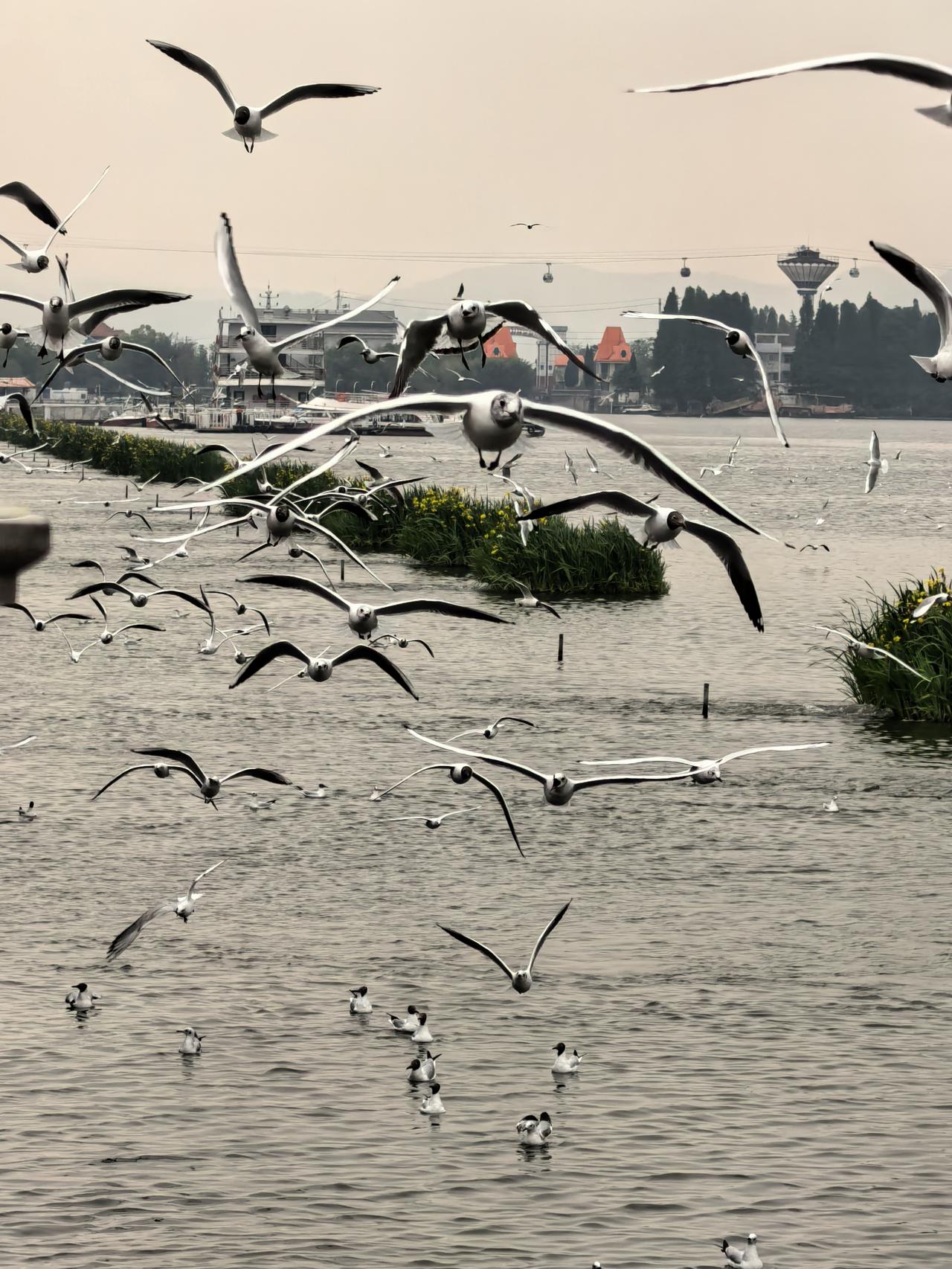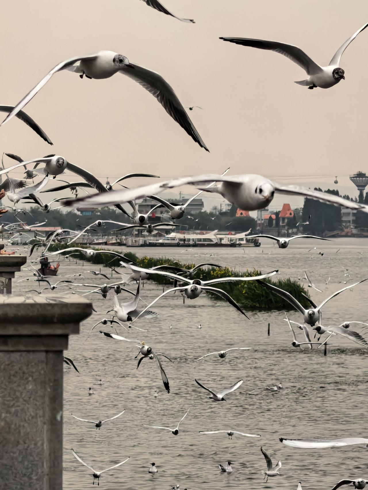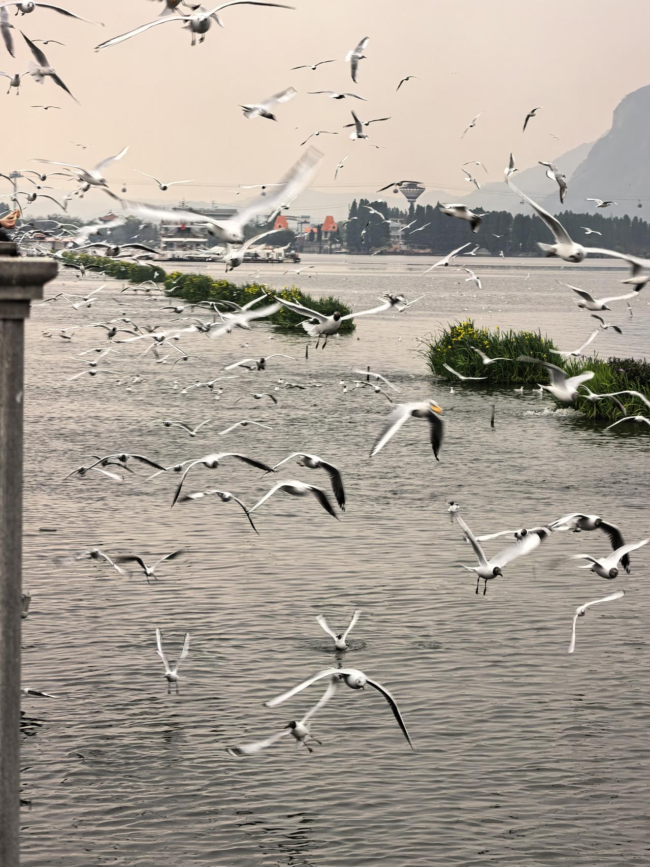 滇池边的“无人机”——红嘴鸥 滇池畔,红嘴鸥化身灵动的“空中无人机”,振翅穿梭。它们衔着西伯利亚的风,赴一场跨越山海的约定。春天,还没有迁徙的红嘴鸥,虽然数量没有冬天那么多,它们留在滇池,继续给人们带来欢乐。你看,这些小精灵俯冲时如精准的巡航轨迹,悬停似悬停待命的机身,每一次振翅,都在滇池的碧波上绘出流动的诗行。 面包屑抛起的瞬间,白羽划出优美弧线,仿佛解锁了自然的互动程序。它们停驻肩头,翅膀轻擦发梢,把治愈揉进每一次近距离的相遇。四十年奔赴,这群白色精灵用翅尖,在滇池边写下最长情书,让春城的春天,满是会飞的浪漫。