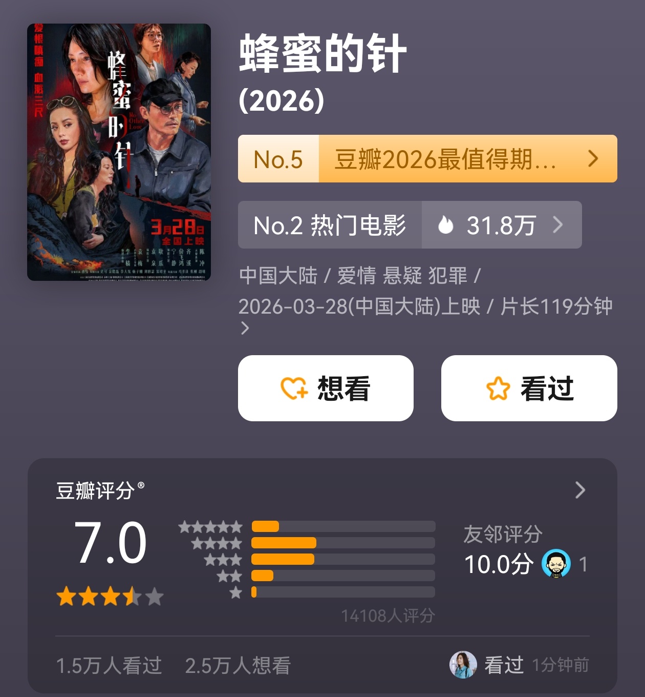 《蜂蜜的针》豆瓣7分。票房马上700万。