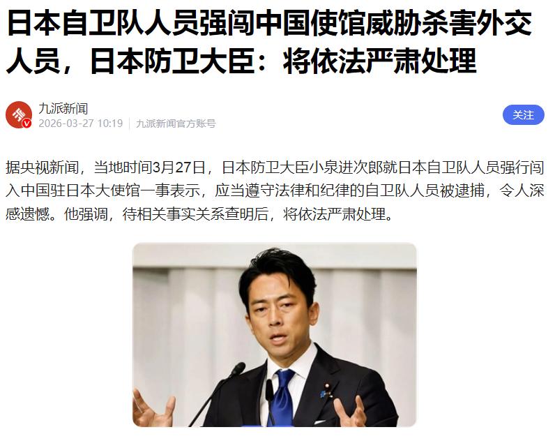 “高市与小泉向中国道歉”!日方妄想包庇暴徒,中方:继续给我查! 3月24日,日本陆上自卫队23岁三等陆尉村田晃大,携带18厘米长刀具翻墙闯入中国驻日使馆,公然威胁要“以神的名义”刺杀中方外交人员。 这起现役军人暴力闯馆事件,是对中国主权的公然挑衅,更是对《维也纳外交关系公约》的粗暴践踏。 事件发生后,日方的处理态度令人震惊。 从上午9时事发到当晚7时,日本警视厅才以“非法侵入建筑物”将其逮捕,拖延10小时之久,期间既未及时通报,也未采取有效措施。 日本主流媒体初期集体沉默,后续报道刻意淡化事件严重性,将焦点引向嫌疑人“精神状态”,试图掩盖其现役军人身份与暴力行为的本质。 更荒诞的是,村田晃大突然翻供,声称闯馆是“想当面向中国大使提意见”,持刀是为“若不接受意见就自杀震慑对方”。 共同社记者在外交部记者会上公然歪曲事实,为暴徒洗白,被外交部发言人林剑当场驳斥:“你见过有人未经允许持刀进入使馆同大使交谈的先例吗?” 面对中方严正交涉,日本政府态度敷衍。内阁官房长官木原稔仅轻描淡写表示“深感遗憾”,完全回避持刀威胁外交官的核心事实。 首相高市早苗、防卫大臣小泉进次郎至今未作出任何正式道歉,仅以模糊措辞敷衍,与历史上多次用“遗憾”替代“道歉”的做法如出一辙。 日本国内民众也对此强烈不满,上千人在东京集会,高喊“高市道歉”“小泉道歉”,要求政府正视事件严重性,向中方作出负责任交代。 中方立场坚定明确,已在北京和东京两地向日方提出严正交涉,要求全面、严肃、彻底调查事件,严惩不法分子,切实保障中国驻日使领馆及人员安全,深刻反思并杜绝类似事件再次发生。 这起事件绝非偶然,暴露日本自卫队人员管理、物品管控、安全预警等多重制度漏洞。 在防卫预算持续上升、防务动作密集的背景下,日本内部管理却严重松动,极右翼思潮泛滥,给地区和平稳定带来巨大风险。 日方妄想以“遗憾”包庇暴徒、推卸责任,绝不可能蒙混过关。 中方将继续紧盯事件进展,要求日方给出负责任交代,用实际行动维护国家主权与国际正义。