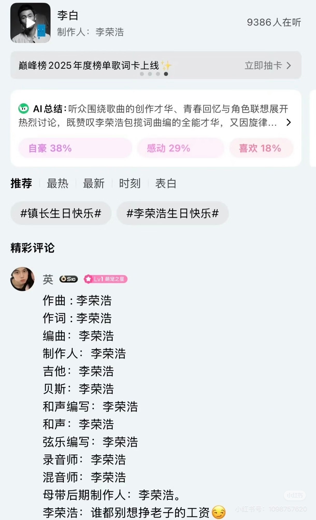 李荣浩曾因发博掉十个粉丝不敢发了怎么说还是太有梗了,而且真的很有才华啊,一趟下来全是李荣浩的名字,