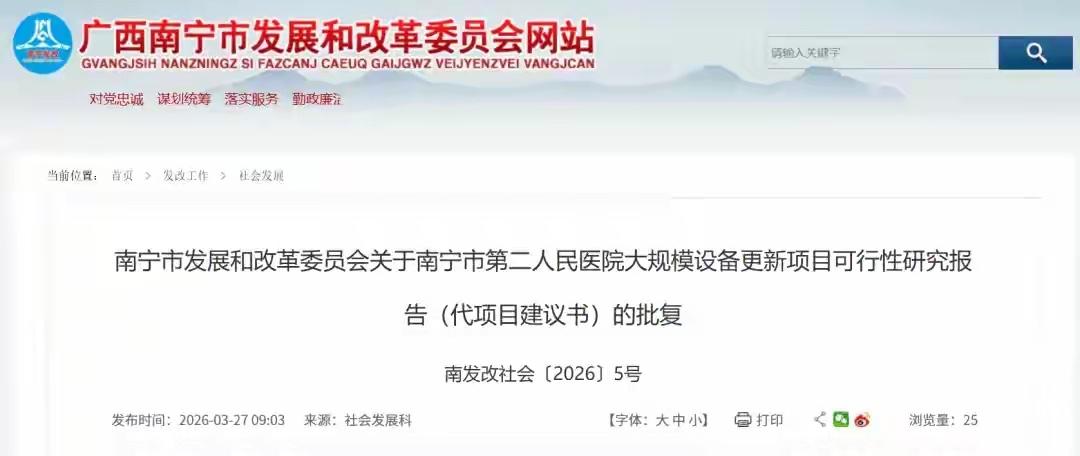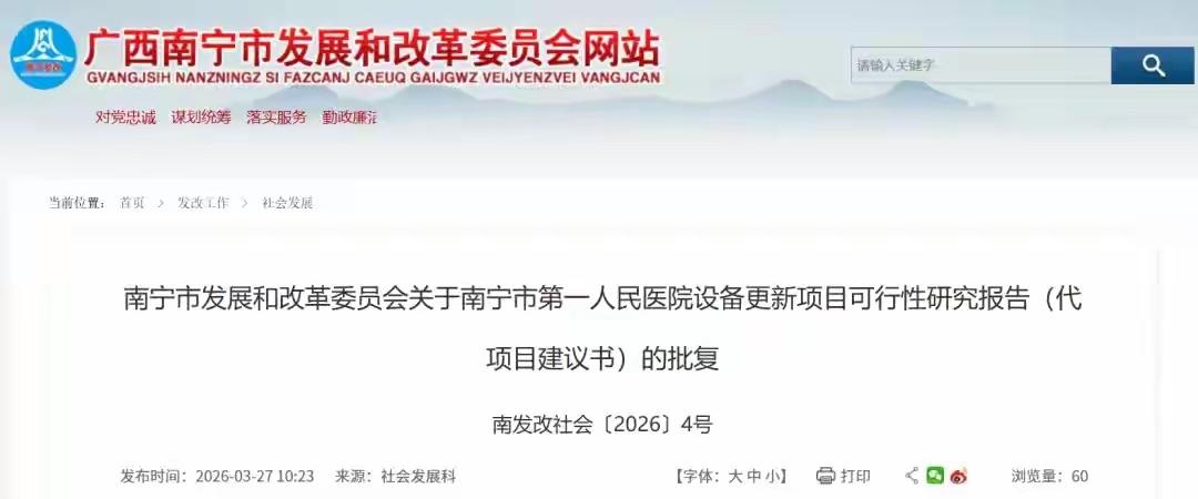 🔥 突发!南宁人沸腾了!三家医院狂砸1.5亿“换血”,重磅利好来了! 家在南宁的朋友注意啦!好消息来得正是时候! 近日,南宁市发改委一口气连发三则批复,瞄准了全市人民的健康大事!市一医院、市二医院、市六医院三家核心公立医院,将迎来总投资超 1.5亿元 的设备大更新!这波民生大礼包,真的太硬核了!🧧 此次更新,可不是小打小闹,而是重量级装备齐上阵! 👑 南宁市第一人民医院(青秀区+埌东分院):豪掷 6754.28万元!一口气更新46台设备,包括咱们看病最常用的 64排螺旋CT、用于血管介入的 DSA 设备,以及30台血液透析机。以后看诊,影像更清晰,诊断更精准,效率直接拉满! 🚀 南宁市第二人民医院(江南区):砸下 3851.58万元!重点升级“眼睛”和“大脑”,引进256排CT和 3.0T磁共振 两台顶级设备。无论是复杂的骨科检查,还是精细的脑部扫描,未来都能更快、更准! 🛡️ 南宁市第六人民医院(西乡塘区):投入 4609.32万元!更新15套核心设备,涵盖CT、彩色多普勒超声、腹腔镜系统等。这意味着西乡塘片区的居民在家门口就能享受更优质的医疗服务,看病更方便! 💰 资金方面,大家可以放心,由超长期特别国债和医院自筹共同保障,每一分钱都花在刀刃上! 💡 划重点:设备更新后,不仅看病更踏实,科研水平也会跟着上一个台阶。未来的南宁,医疗硬实力越来越强,咱们市民的健康“安全网”也织得更密了! 目前项目正在推进中,具体投用时间,请持续关注医院官方公告。让我们一起期待更健康、更有安全感的南宁生活!