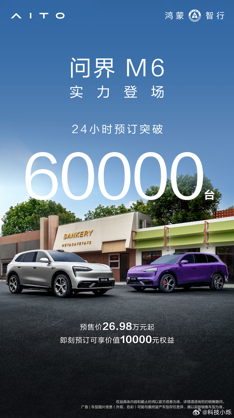 问界M6近七成小订用户为90后 在问界M6店里,听到几位年轻人聊选车经历,对这车标配的新一代896线双光路图像级激光雷达赞不绝口。纯电版车主则更看重882升后备箱和202升前备箱的大空间。销售说这些90后买家比他们还懂配置,难怪预售24小时订单就破了6万,看来大家都挺识货的。问界M6小订纯电版订单近五成