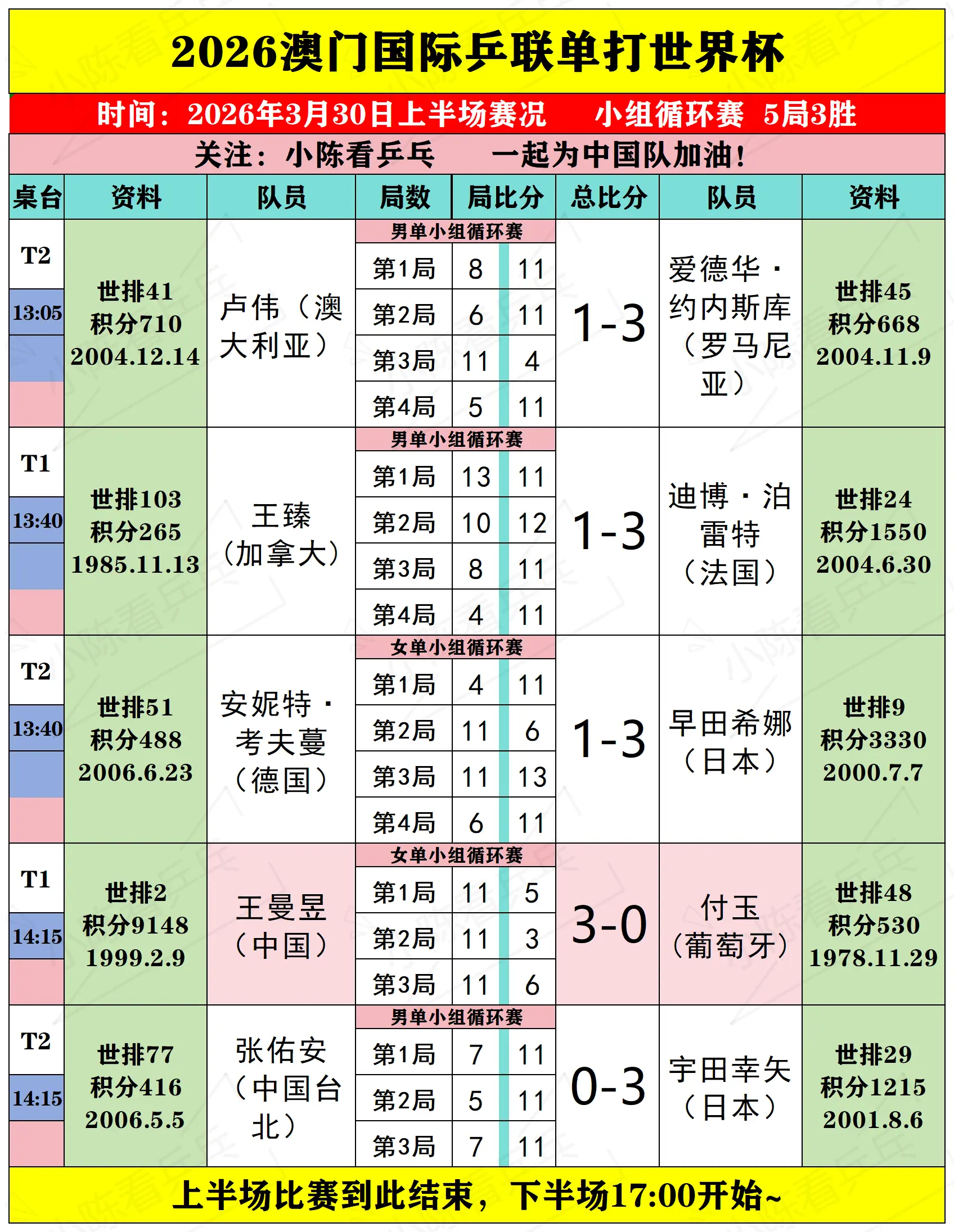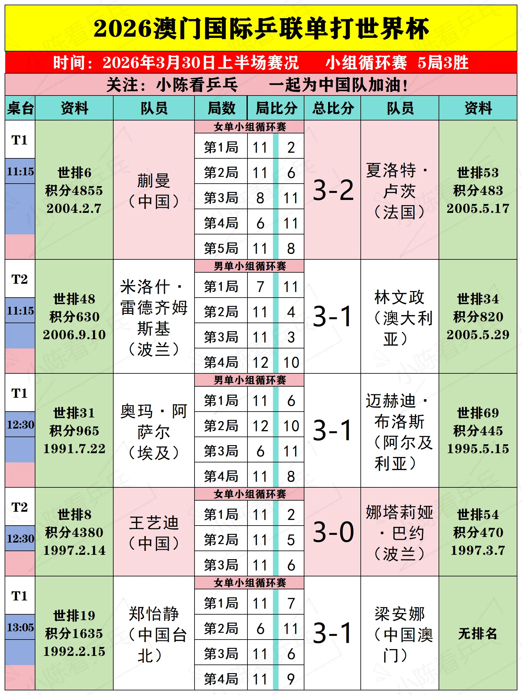 2026澳门单打世界杯3月30上半场赛况。2026澳门单打世界杯3月30日上半场比赛结果,男女单打小组循环赛,中国队上半场全部取得胜利,周启豪3-1川上流星,蒯曼3-2夏洛特·卢茨,王艺迪3-0娜塔莉娅·巴约,王曼昱3-0付玉,中国队继续加油。