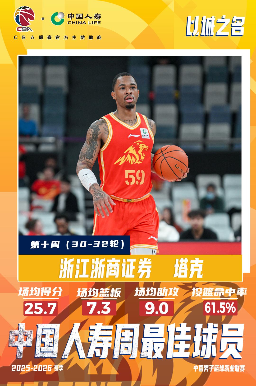 【赵睿、塔克当选2025-2026赛季CBA联赛常规赛第十周中国人寿周最佳球员】北京北汽球员赵睿本周出战3场并率队取得全胜,他场均出场27分钟,能够得到19.3分、3.3篮板、6.7助攻,投篮命中率63.3%、三分命中率达到69.2%,且场均能够命中3记三分球。凭借赵睿出色的表现,北京北汽也取得一波三连胜,重新回到联赛排名榜前三。 浙江浙商证券球员塔克本周出战3场率队取得全胜,他场均出场31分钟,能够得到25.7分、7.3篮板、9助攻的全面数据,投篮命中率61.5%。在对阵天津先行者的比赛中,塔克拿到了28分、10篮板、14助攻的三双数据。