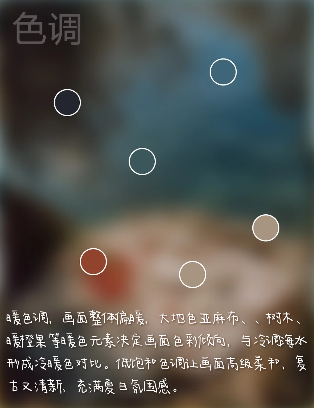 暖色调,画面整体偏暖,大地色亚麻布、、树木、暖橙果等暖色元素决定画面色彩倾向,与冷调海水形成冷暖色对比。低饱和色调让画面高级柔和,橄榄绿与暖橙相互平衡,复古又清新,充满夏日氛围感。