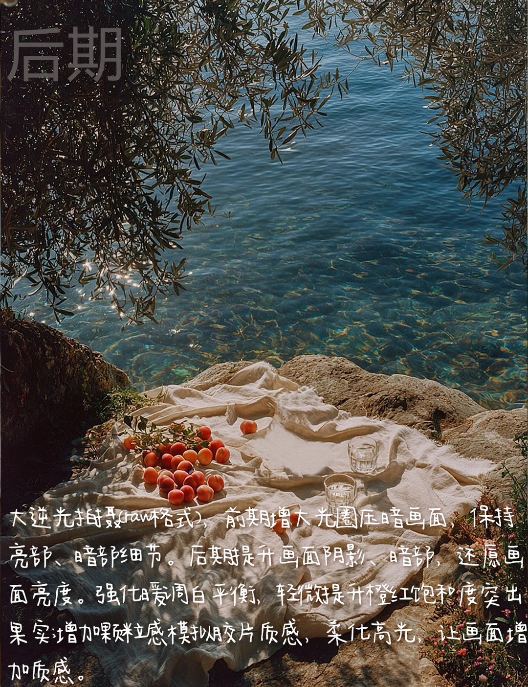 大逆光拍摄(raw格式),前期增大光圈压暗画面,保持亮部、暗部细节。后期提升画面阴影、暗部,还原画面亮度。强化暖调白平衡,轻微提升橙红饱和度突出果实;增加颗粒感模拟胶片质感,柔化高光,让画面增加质感。