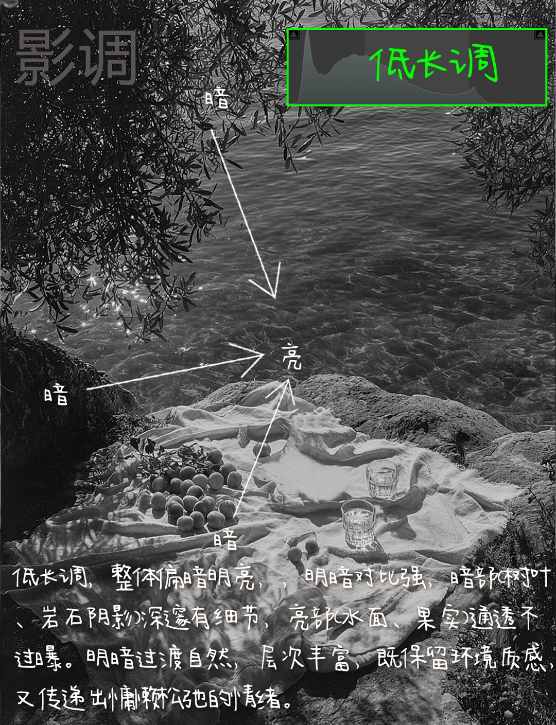 低长调,整体偏暗明亮,,明暗对比强,暗部(树叶、岩石阴影)深邃有细节,亮部(水面、果实)通透不过曝。明暗过渡自然,层次丰富,既保留环境质感,又传递出慵懒松弛的情绪。