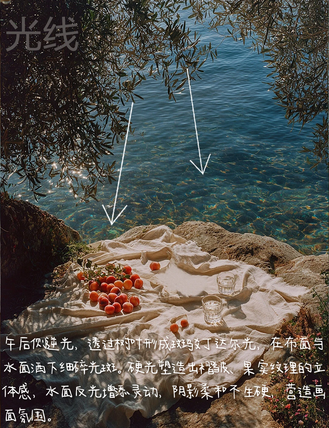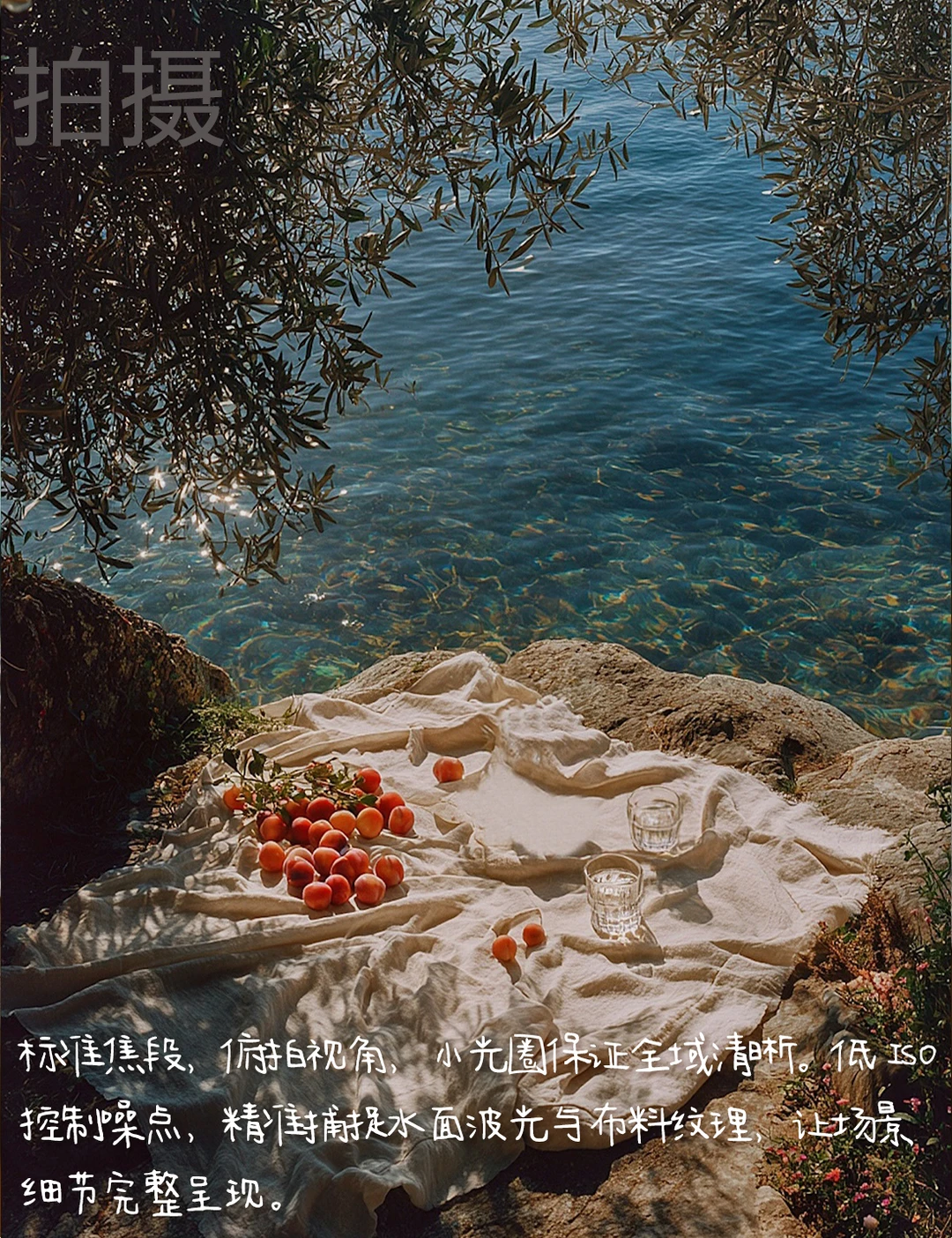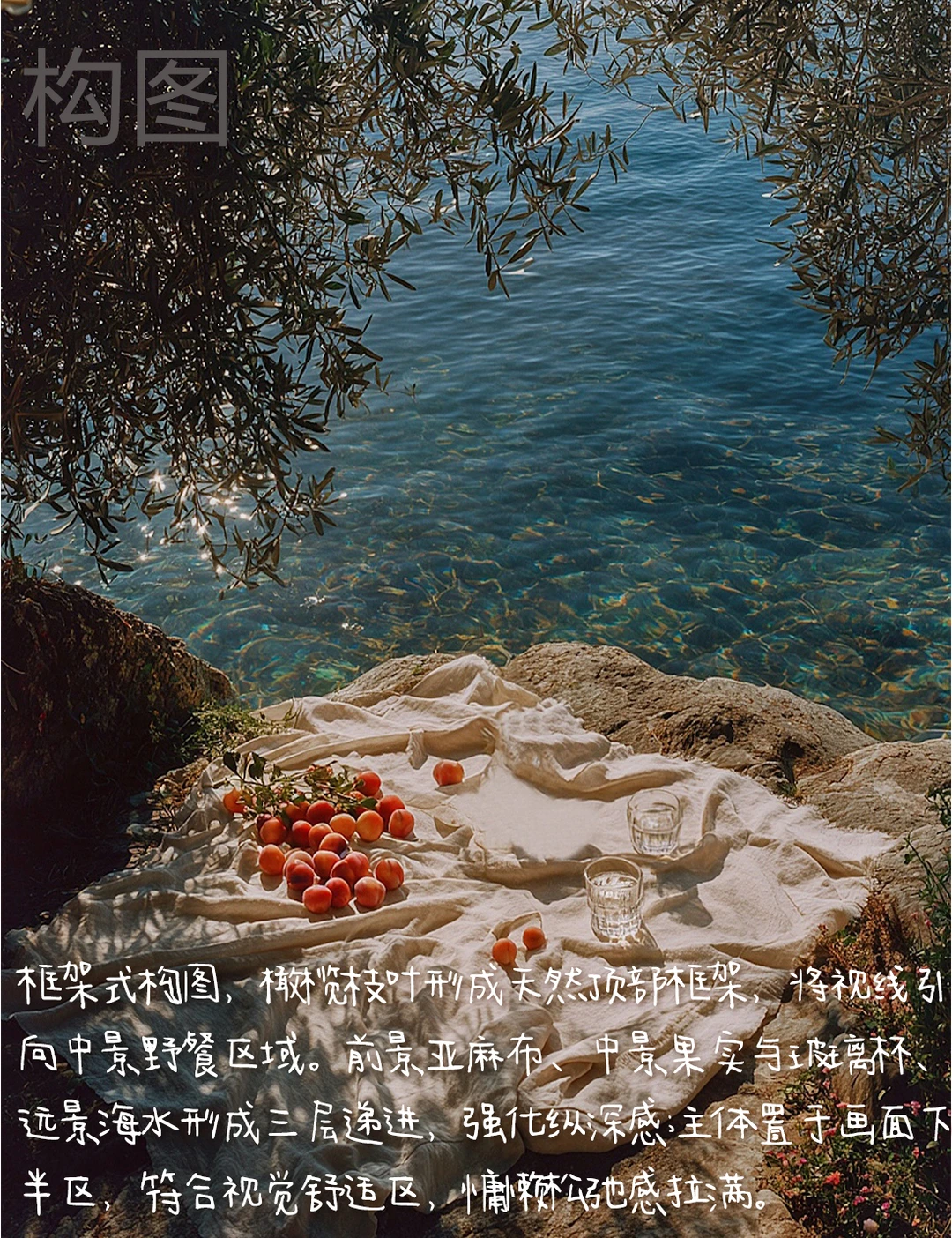框架式构图,橄榄枝叶形成天然顶部框架,将视线引向中景野餐区域。前景亚麻布、中景果实与玻璃杯、远景海水形成三层递进,强化纵深感;主体置于画面下半区,符合视觉舒适区,慵懒松弛感拉满。